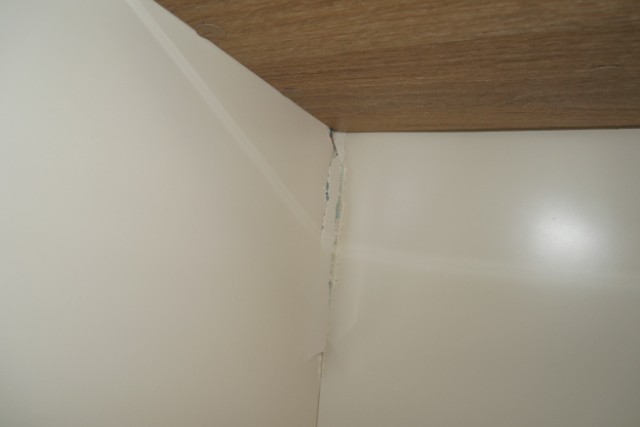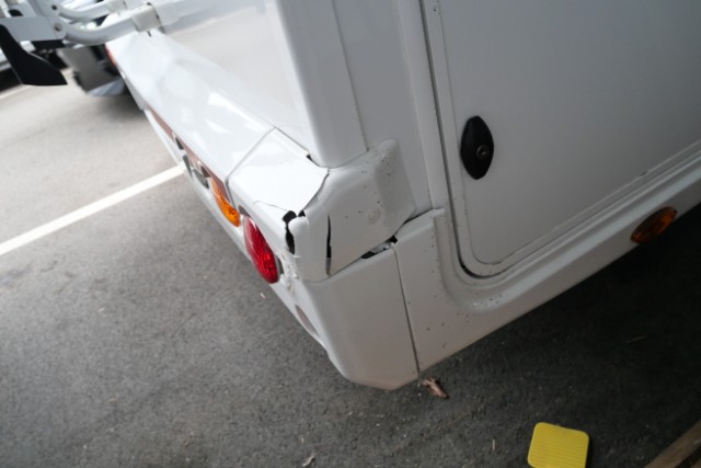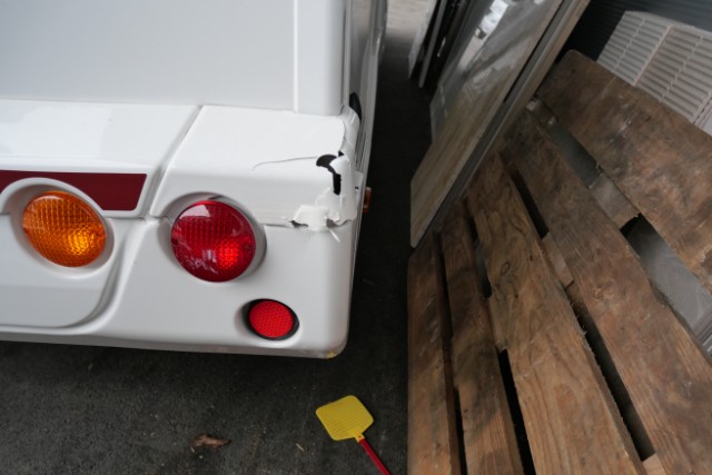 Seite rechts eingedrückt. Seite rechts hat ein Loch. Heck eingedrückt.