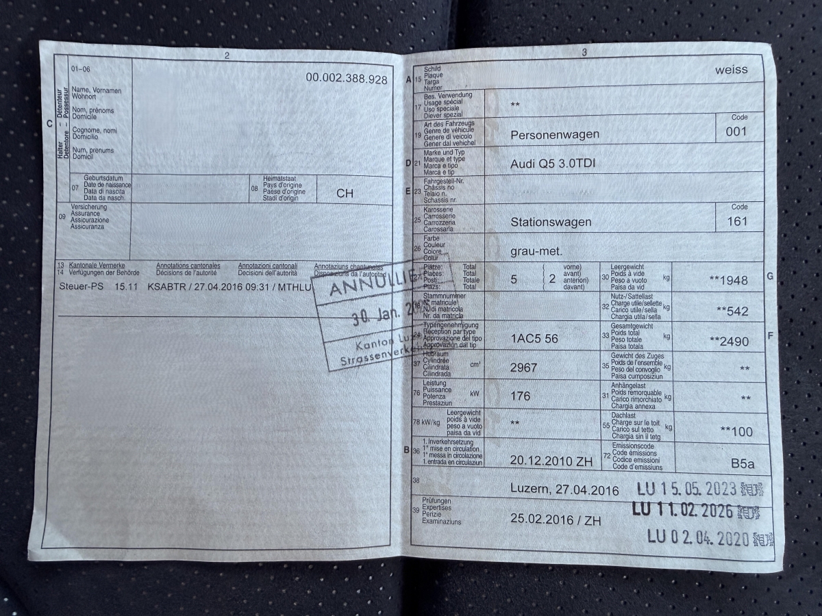 Zusätzliche Beschädigungen:Das Fahrzeug hat rundum kleine Dellen, Beulen und Lackschäden (siehe Fotos).ACHTUNG:Fahrzeug frisch ab MFK, 11.02.2026Fahrzeug hat sichtbare Carrosserieschäden,WICHTIG:Das Fahrzeug muss nach Rechnungserhalt innerhalb 48 Stunden bezahlt und abgeholt werden, damit keine Standkosten entstehen.Wichtig:Mechanischer Zustand unbekannt, wurde nicht geprüft.Achtung:Die Reparaturkosten konnten nicht ermittelt werdenAchtung:Bei dieser Auktion handelt es sich vorerst um eine Restwert-Ermittlung, bei der ein definitiver Verkauf bzw. die Abgabe des Objektes an den Höchstbietenden von einem allfälligen Übernahmeangebot des Fahrzeughalters abhängt.Wichtig:Bei dieser Auktion handelt es sich um einen Konsignationsverkauf. Die Rechnungsstellung erfolgt wie folgt: Verkaufspreis + allfällige Bearbeitungsgebühr + Mehrwertsteuer (zuzüglich MwSt). Der Betrag muss vor der Abholung überwiesen worden sein.Das Fahrzeug steht beim nachfolgend aufgeführten Standortbetrieb und muss vor Gebotsabgabe besichtigt werden.Bitte melden Sie Ihren Besuch beim Standortbetrieb telefonisch an:AXA Mobility Services AGHölzliwisenstrasse 118604 Volketswil/ZH058 215 88 08ACHTUNG:Diese Restwertermittlung wird im Auftrag von derAXA Mobility Services AG (AMS)durchgeführt!Es gelten folgende besondere Bestimmungen:1. Nach Ablauf der Restwertermittlung wird das Höchstgebot an dieAXA Mobility Services AG (AMS)übermittelt.2. Der Höchstbietende bleibt nach Ablauf der Gebotsfrist während drei Wochen (21 Tage) an sein Gebot gebunden.3. Der Höchstbietende wird durch dieAXA Mobility Services AG (AMS)überdas weitere Vorgehen informiert!4. Bitte wenden Sie sich bei Fragen direkt unter:[email protected] (vom Fahrzeugexperten) ermittelten Reparaturkosten beziehen sich auf das versicherte Ereignis. Allfällige zusätzliche, nicht versicherte Schäden/Vorschäden, sind in den Reparaturkosten nicht enthalten. Die deklarierten Ausstattungsmerkmale können von der effektiven Ausstattung abweichen.AchtungBei einem Hochvoltsystem - Spannungsfreiheit prüfen. Sicherheitshinweise und Betriebsanleitungen des Herstellers konsultieren und befolgen.