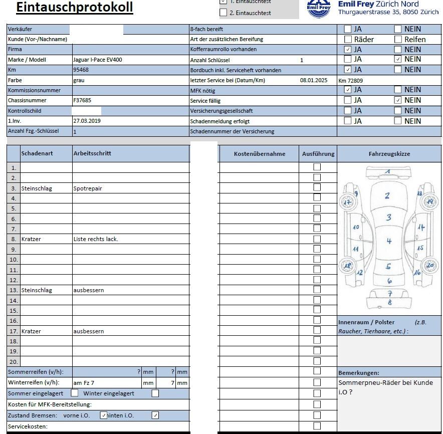 Keine Gewähr auf die Angaben der Sonder- und Serienausstattung / keine mechanische Prüfung. Fahrzeug wurde unzerlegt expertisiert / keine Haftung für allfällige, nach Demontage bekanntwerdenden Mängel. Fahrzeugbereifung und Ausstattung gemäss Fotos / Fahrzeugkauf auf eigenes Risiko ab Platz ohne Nachwährschaft.- Diverse Kratzer und Dellen am gesamten Fahrzeug.- Steinschlag Frontscheibe- Steinschlag Kotflügel vorne rechts- Letzter Service am 08.01.2025 bei 72'809 Km.