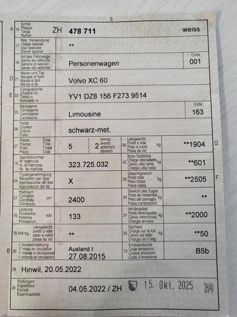 Wartungen wurden in Volvo Garage gemacht. Letzte Herbst 2025 Auto hat kleinere Carrosseriemängel, siehe Foto. Auf hi Türe li kleine Kratzer auf Bilder nicht sichtbar. Das Auto ist technisch in Ordnung jedoch sind kleinere Mängel nicht auszuschliessen. Auto wird ohne Garantie verkauft.