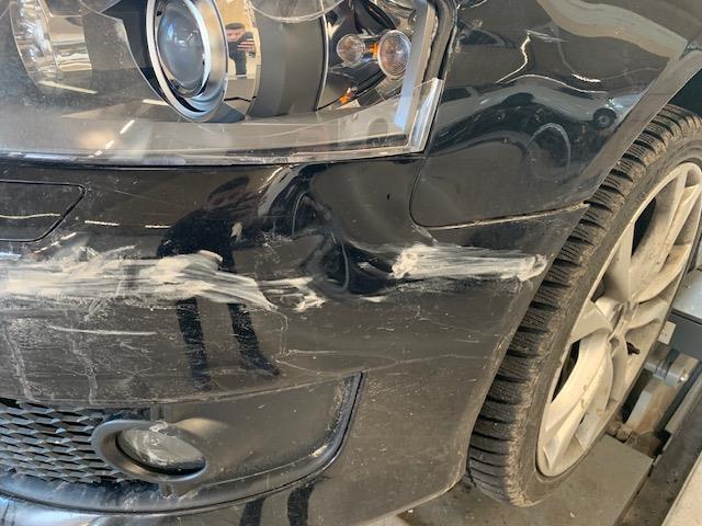 Front links eingedrückt. Kotflügel vorne links eingedrückt. Motorhaube eingedrückt. Frontblech/Maskenblech eingedrückt. Fahrzeugvorbau verschoben.
