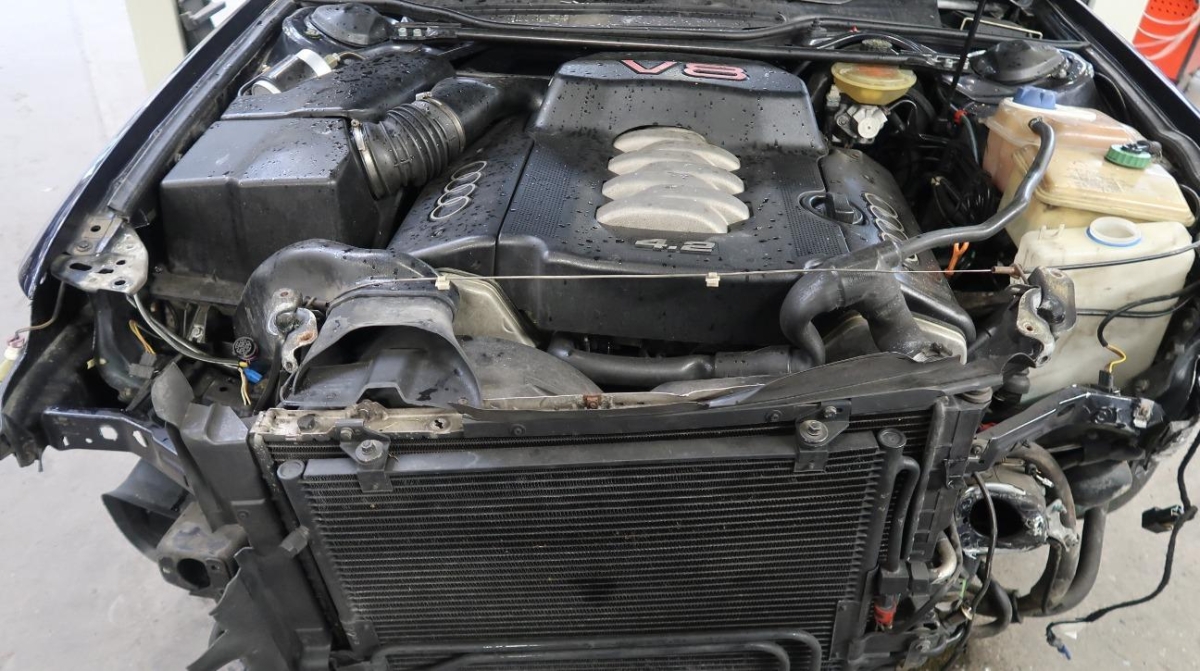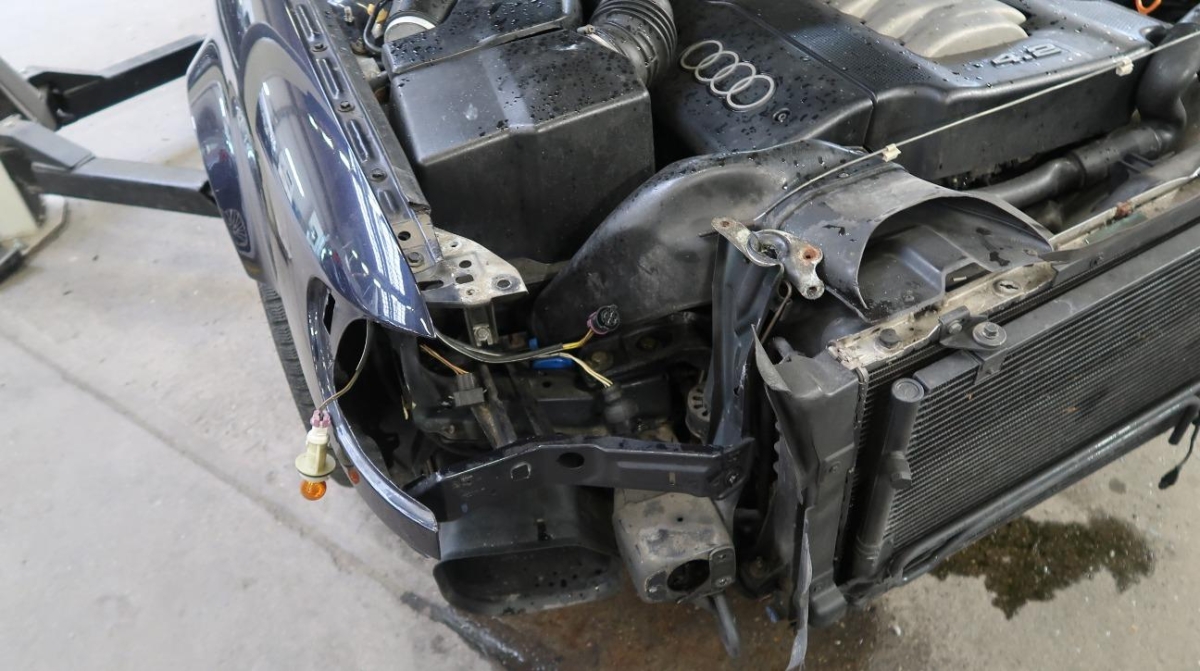 Diverse Anbauteile, Federbein vorne links, Front, Front links, Front rechts, Frontblech, Klimakühler, Kotflügel links, Kotflügel rechts, Kühler, Kühlgitter, Lenkung, Längsträger vorne links, Längsträger vorne rechts, Motorhaube, Querträger, Rad vorne links, Radaufhängung vorne links, Radhaus vorne links, Radhaus vorne rechts, Scheinwerfer links, Scheinwerfer rechts, Schlossträger, Stosstange vorne, Türe vorne links, Vorderachse