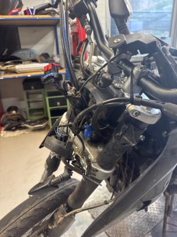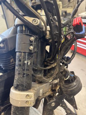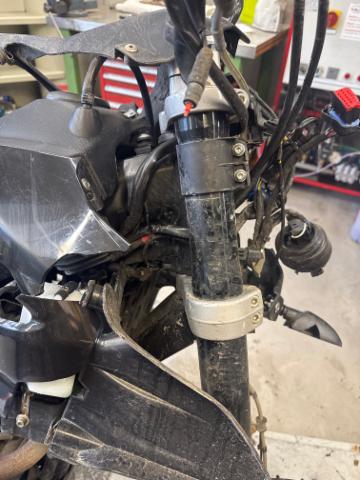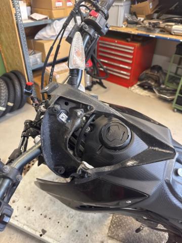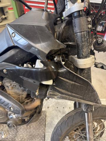 Schutzblech vorne defekt. Vorderrad beschädigt. Gabel beschädigt. Lenker verbogen. Frontblech/Maskenblech eingedrückt. Fahrzeugvorbau verschoben.