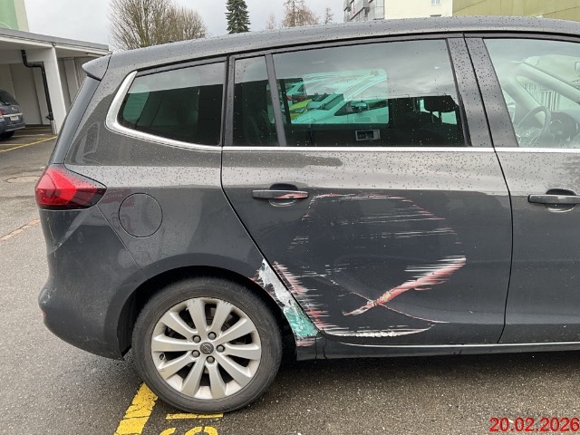Beschreibung der Schäden: Seitenschaden hinten rechts. Türe HR und Seitenwand HR. Seitenwand HR weist einen nicht fachmännisch reparierten Vorschaden auf (viel Spachtel). Frontscheibe Steinschlag mit Abplatzung. Vorbestandene Schäden: Mitte (Dach/Boden): einzelne Dellen festgestellt. Gebrauchsspuren