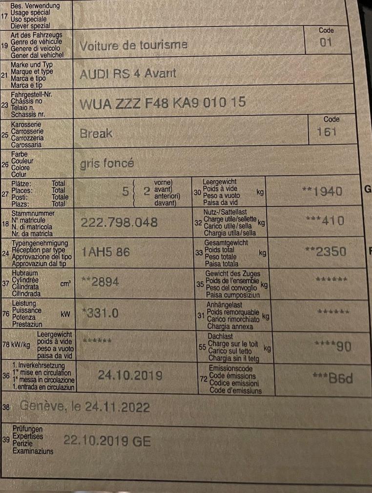 T3 nardograu 0.00 UB schwarz - felsgrau 0.00 EA8 Anschlussgarantie 4. und 5. Jahr, max. 100'000 km, (netto) 1’050.00 WK5 Paket "Infotainment" 4’680.00 9VS Bang & Olufsen Sound System mit 3D Klang, 755 Watt 16-Kanal-Verstärker 1’110.00 PNQ MMI Navigationssystem plus mit MMI touch 0.00 IT3 Audi connect (Verlängerung auf 3 Jahre Nutzung von Audi connect Diensten) 0.00 X Audi sound system 0.00 X Navigationssystem plus 0.00 X Audi phone box 0.00 X Audi connect (3 Jahre) 0.00 UI2 Audi smartphone Interface 0.00 0P6 RS-Sportabgasanlage, 2-flutig, mit schwarz glänzenden, ovalen Endrohrblenden 1’560.00 3FU Panorama-Glasdach 1’920.00 3S2 Dachreling schwarz 0.00 4GR Klimakomfortscheibe drahtlos beheizbar 550.00 6FQ Aussenspiegelgehäuse in Carbon 1’560.00 6XL Aussenspiegel mit Memoryfuktion, autom. abblendend und el. anklappbar, einstell-, beheizbar, inkl. Bordsteinautomatik für Beif.- 450.00 PA7 Optikpaket Carbon inkl. Anbauteile in schwarz glänzend 5’920.00 X Frontspoiler in Carbon 0.00 X Diffusor in Carbon 0.00 X Einleger der Schwellerverbreiterungen in Carbon 0.00 VW6 Privacy-Verglasung (Scheiben ab B-Säule abgedunkelt) und Akustikverglasung für die vorderen Türscheiben 630.00 PA2 RS-Dynamikpaket 7’670.00 PXC Audi Matrix LED-Scheinwerfer inkl. dynamischem Blinklicht Front und Heck, Scheinwerfer-Reinigungsanlage 0.00 GH2 quattro mit Sportdifferenzial 0.00 6Y4 Anhebung der Höchstgeschwindigkeit auf 280 km/h 0.00 2MC RS-Sportfahrwerk plus mit Dynamic Ride Control (DRC) 0.00 1N8 Dynamiklenkung 0.00 PQQ Aluräder 9J x 20, 5-Doppelspeichen-Edge-Design, anthrazitschwarz, Reifen 275/30 R20 3’000.00 UH2 Anfahrassistent 110.00 0VB Bordliteratur franz. 0.00 3Y4 Sonnenschutzrollo manuell für die Türscheiben hinten 200.00 5MB Dekoreinlagen Carbon Köper 1’300.00 5XF Sonnenblenden verschiebbar 70.00 7HD Ledervariante Belederungspaket in Feinnappa 850.00 9JE USB Ladeschnittstelle für die Fondpassagiere (Nichtrauchervariante) 70.00 9S8 Audi virtual cockpit 12,3" 650.00 KS1 Head-Up Display 1’280.00 QQ2 Kontur-Ambiente-Lichtpaket, (mehrfarbig) 130.00 VC2 Garagentoröffner 310.00 N1H Sitzbezüge in Leder Feinnappa mit Kontrastnaht in Wabensteppung 1’110.00 PV3 Vordersitze elektrisch einstellbar mit Memory-Funktion für den Fahrersitz inkl. 4-Wege-Lendenwirbelstütze 270.00 GB1 LTE-Unterstützung für Audi phone box 0.00 PCN Assistenzpaket Tour 1’560.00 X ACC Stop & Go inkl. Stauassistent 0.00 X Abbiegeassistent 0.00 X Ausweichassistent 0.00 X Prädiktiver Effizienzassistent 0.00 X Audi active lane assist 0.00 X Audi pre sense front 0.00 QR9 Kamerabasierte Verkehrszeichenerkennung 0.00 PCZ Assistenzpaket Stadt & Parken 1’310.00 X Assistenzpaket Stadt 0.00 X Assistenzpaket Parken 0.00 #F1 BusinessPlus 0.00