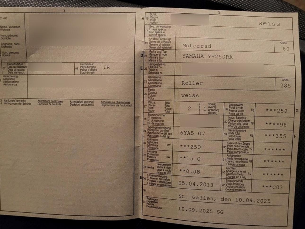 Scooter wird ohne Handwärmer und Top-Case verkauftDie (vom Fahrzeugexperten) ermittelten Reparaturkosten beziehen sich auf das versicherte Ereignis. Allfällige zusätzliche, nicht versicherte Schäden/Vorschäden, sind in den Reparaturkosten nicht enthalten. Die deklarierten Ausstattungsmerkmale können von der effektiven Ausstattung abweichen.AchtungBei einem Hochvoltsystem - Spannungsfreiheit prüfen. Sicherheitshinweise und Betriebsanleitungen des Herstellers konsultieren und befolgen.