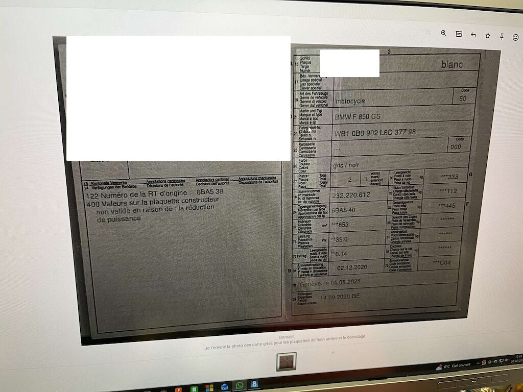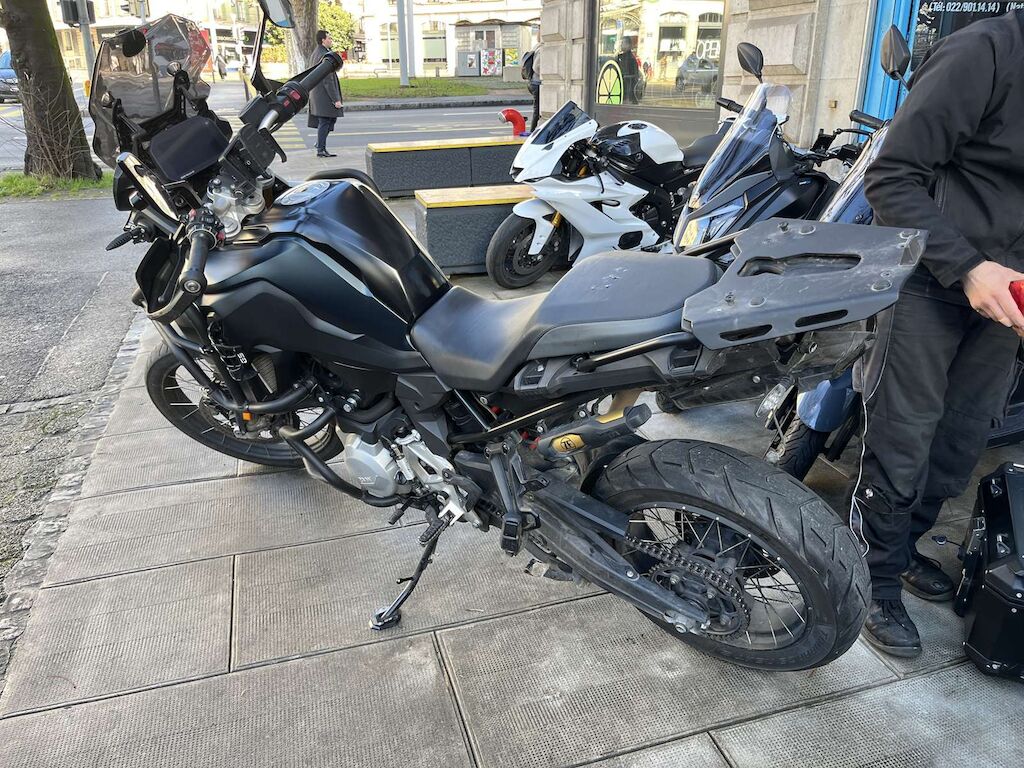 Chute côté gauche et projection côté droit: Rétroviseur, protège main, barre de protection, repose pied gauche, sélecteur de vitesse, béquille, entourage de réservoir endommagés et râpés. Echappement, bras oscillant, repose pied droit, levier de frein arrière, barre de protection, feux brouillard, protège main, rétroviseur et guidon endommagés et râpés. Feu arrière, support de plaque, pare-boue cassé. Motor Getriebe Vorderachse Hinterachse Airbags ausgelöst: 0 Ja ( Abfallcode 16.01.04ak )