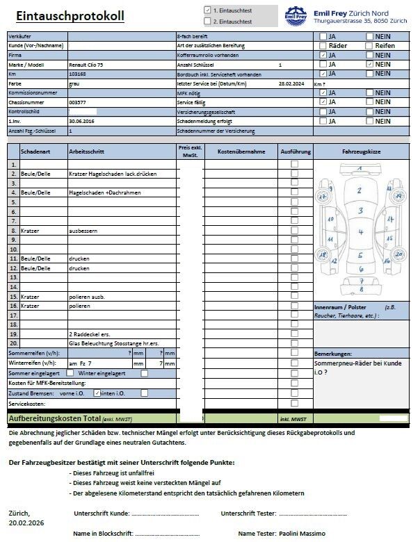 Keine technische Prüfung (Werkstatttest) vorgenommenDiverse Schäden an Karosserie/Lack.Fahrzeug ab Platz, ohne Garantie und Aufbereitung.DPF/FAP Filter nicht kontrolliertKeine Gewähr auf die Angaben der Sonder- und Serienausstattung / keine mechanische Prüfung. Fahrzeug wurde unzerlegt expertisiert / keine Haftung für allfällige, nach Demontage bekanntwerdenden Mängel. Fahrzeugbereifung und Ausstattung gemäss Fotos / Fahrzeugkauf auf eigenes Risiko ab Platz ohne Nachwährschaft.- Div. Kratzer und Beulen- Hagelschaden- 2 defekte Raddeckel