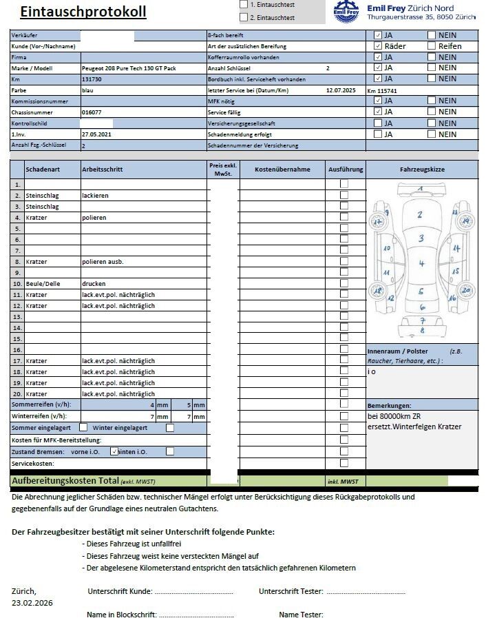 Keine technische Prüfung (Werkstatttest) vorgenommenDiverse Schäden an Karosserie/Lack.Fahrzeug ab Platz, ohne Garantie und Aufbereitung.DPF/FAP Filter nicht kontrolliertKeine Gewähr auf die Angaben der Sonder- und Serienausstattung / keine mechanische Prüfung. Fahrzeug wurde unzerlegt expertisiert / keine Haftung für allfällige, nach Demontage bekanntwerdenden Mängel. Fahrzeugbereifung und Ausstattung gemäss Fotos / Fahrzeugkauf auf eigenes Risiko ab Platz ohne Nachwährschaft.- Div. Kratzer und Dellen