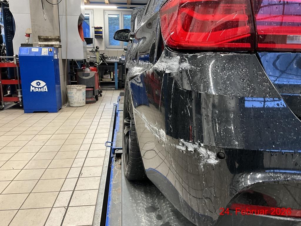 Seite links: Stossstange + Scheinwerfer gebrochen. Kotflügel, Tür vorne, Seitenwand hinten eingedrückt. Stossstange + Schlussleuchte gebrochen. Felgen links zerkratzt. Radaufhängungen verformt. Aufzählung nicht abschliessend / Vorbestandene Schäden: Rückspiegel rechts zerkratzt + Gebrauchsspuren