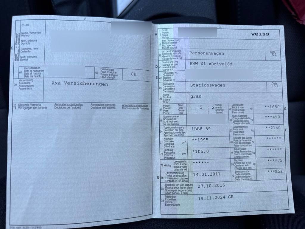 Exterieurumfänge in Wagenfarbe, Window-Kopfairbags, Höhenverstellbare Gurten vorne, Befestigungsösen im Laderaum, 3 Speichen-Lederlenkrad, Airbag: Seitenairbag für Fahrer und Beifahrer, Make up-Spiegel rechts, Airbag: Airbag Fahrer und Beifahrer, Reifendruckverlust-Warnsystem, Gurtstraffer vorne, Aussenspiegel rechts und links beheizbar und elektrisch verstellbar, Licht: Nebelschlussleuchte, Assist: Anfahrassistent, Elektrische Lenkung (EPS), Lenkrad: Lenkrad längs- und höhenverstellbar, Getriebe: 6-Stufen-Automat Steptronic, Nichtraucherausführung, Elektrische Fensterheber vorne + hinten, Sicherheitstrennnetz oder /-gitter im Gepäckraum, Vordersitze höhenverstellbar, Wegfahrsperre elektronisch, Lenkung, elektrisch unterstützt, Lederhandbremshebel, Antiblockiersystem (ABS), Partikelfilter und Oxydationskatalysator, Abschliessbare Radschrauben, Nebelscheinwerfer, Check-Control-System, Aussentemperaturanzeige, Assist: Cornering Brake Control (CBC), Verbandskasten, Leichtmetallfelgen im Sternspeichen- design 317 17J mit Pneu, Assist: Dynamische Traktionskontrolle (DTC), Radio BMW Business CD, 5 Lautsprecher, Aktive Kopfstützen, Handschuhfach, Klima: Klimaanlage, Lackierung: Uni-Lackierung, Aux-In Anschluss, Hill Descent Control (HDC), Dekor: Interieurleisten in Satinsilber matt, Schalthebelknauf in Leder, Coming-home-Funktion, BMW Mobility System, Veloursfussmatten vorne und hinten, Stoff-Ausstattung Elektra, Allradantrieb permanent, Steckdose, Leuchtweitenregulierung elektrisch, Dynamische Stabilitätskontrolle (DSC), Cupholder, 3 Kopfstützen hinten, Einstiegsschienen, Heckscheibenheizung, Make up-Spiegel links, Bremsbelag-Verschleissanzeige, Rücksitzlehne geteilt abklappbar, Scheibenwischer vorne mit Intervall, Zentralverriegelung mit Fernbedienung, Bordcomputer, Scheibenwaschdüsen beheizt, Drittes Bremslicht, Bremsassistent (BAS), Start-/Stop-Knopf, Mittelkonsole, Automatische Stabilitäts-Control (ASC), ISOFIX Kindersitzvorrichtung