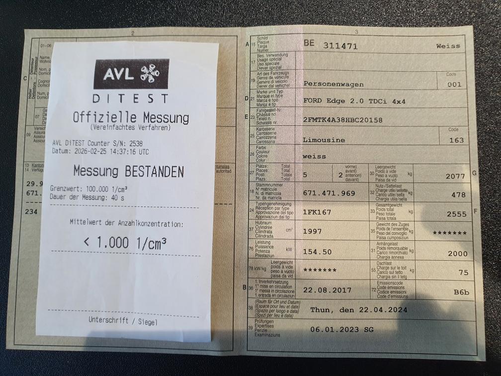 Am Ford Edge ist kein Werkstatttest gemacht worden. Das Fzg. fährt sich gut keine Lampen leuchten. Service ist fällig. Dieselpartikelfilter test wurde gemacht und ist gut. siehe Foto offizielle Messung von 25.02.2026 Bestanden. 2-3 Kratzer und Beulen siehe Foto.