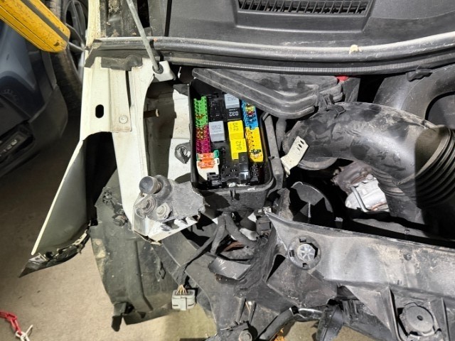 Fussgängerschutz ausgelöst. Front eingedrückt. Front links eingedrückt. Front rechts eingedrückt. Frontblech/Maskenblech eingedrückt. Längsträger vorne rechts und links gestaucht. Fahrzeugvorbau nach rechts verschoben.