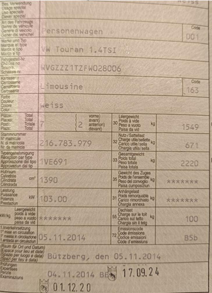 Eintauschfahrzeug im Kundenauftrag zu verkaufen: VW Touran 1.4 TSI (05.11.2014) Aktuell 85'000km, wird noch gefahren letzter eingetragener Service 06.05.2024 letzte MFK 17.09.2024 Sonderausstattung: hinten getönte Scheiben, Rückfahrkamera, 7 Plätzer, Nichtraucher, Tierlos, aus 1.Hand vorne Sitzheizung, DAB Adapter eingebaut Mängel: keine bekannt Defekt: Abdeckung Lüftung hinten defekt/auf Fotos ersichtlich 1xFelge kleine Schramme/auf Fotos ersichtlich Schäden: normale Gebrauchtspuren 8fach bereift inkl. Felgen Profil auf Fotos ersichtlich Verkauf ab Platz ohne Gewähr, besten Dank.