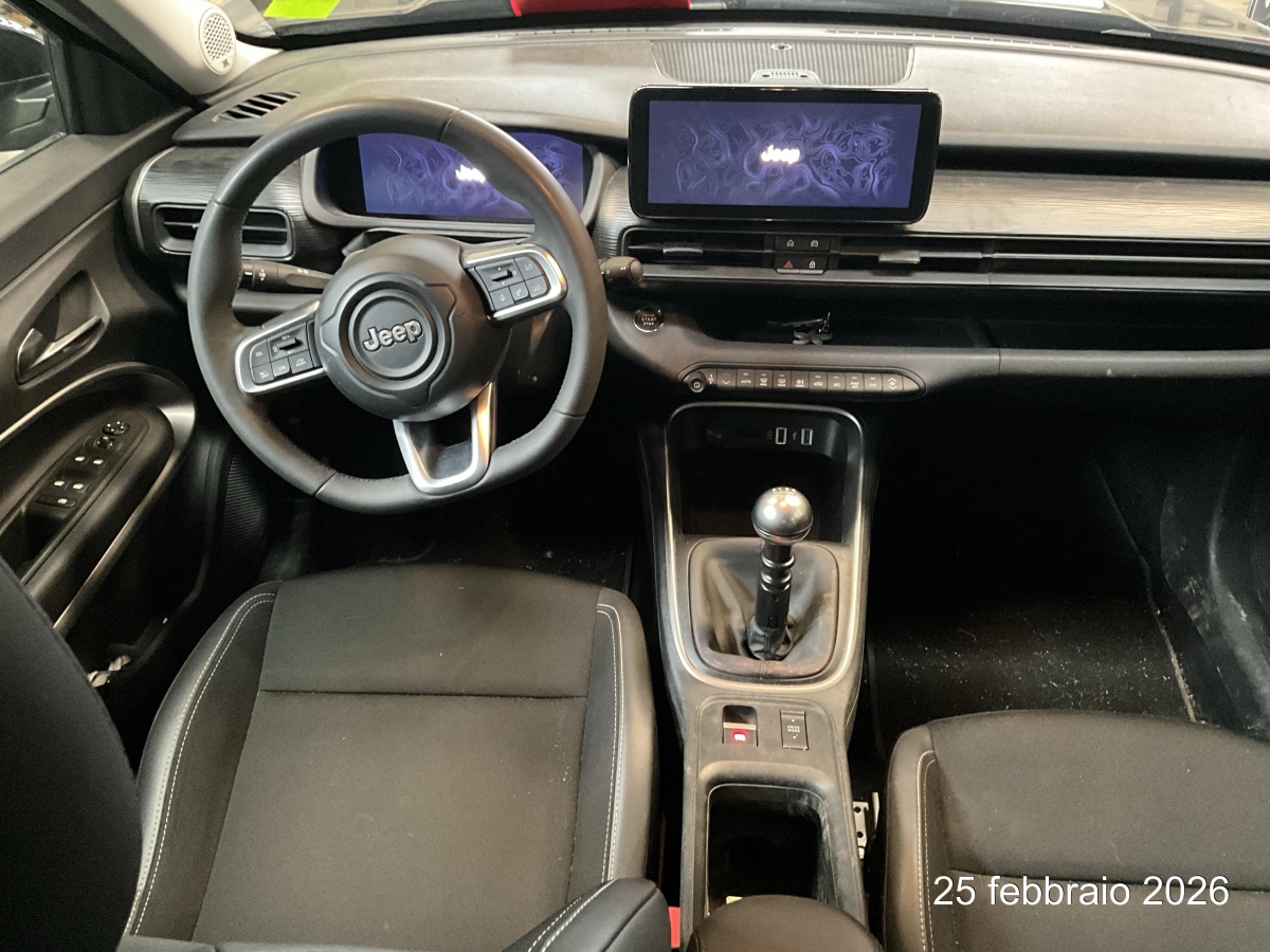 Airbag: Airbag conducente e passeggero, Airbag: Airbag passeggero desattivabile, Alzacristalli con Funzione One Touch, Appoggiateste posteriore regolabili in altezza, Assist: Adaptive Cruise Control, Assist: Assistenza alla frenata di emergenza con rilevamento pedoni, Assist: Controllo discesa Hill Descent Control, Assist: ParkSense Sistema di ausilio al parcheggio: sensori di parcheggio posteriori, Assist: ParkView camera per retromarcia con griglia dinamica, Assist: Riconoscimento dei segnali stradali, Attacco Isofix sul sedile del passeggero, Bracciolo centrale anteriore con vano portaoggetti, Calotte specchietti nere, Cambio: Automatico (una velocita), Caricatore di bordo da 11 kW - trifase, Cavo di ricarica Mode 3 per wallbox o stazione di ricarica pubblica, Chiusura centralizzata con telecomando, Cinture di sicurezza a 3 punti a tutti i posti, Clima: Aria condizionata automatica, Computer di bordo, Decor: Interni e plancia Inserti plancia silver, Freno di stazionamento elettromeccanico, Garanzia: 3 anni o 100'000 km (da 1a messa in circ.), Garanzia: La batteria è garantita per 7 anni o 160 000 km, Immobilizzatore, Keyless Enter-N-Go (apertura / chiusura senza chiave della vettura), Luce: Fari con riflettori a LED e luci diurne, Luce: Luci posteriori alogene, Luce: Retronebbia a LED, Luce: Terza luce di stop, Lunotto posteriore riscaldabile, Manico del passeggero, Maniglie esterne in colore della carrozzeria, Media: Apple Carplay &, Media: DAB+, Media: Presa USB-C con funzione di ricarica per i passeggeri posteriori, Media: Quadro strumenti Display digitale da 10,25 pollici, Media: Sistema audio con 6 altoparlanti, Media: Tasca per smartphone con ricarica wireless, Media: Touchscreen Navi Uconnect Smarttouch 10", Media: Uconnect Services, Pacchetto: Pacchetto di sicurezza, Pacchetto: Pack Winter, Parabrezza riscaldato, Piano di carico bagagliaio regolabile in altezza, Pompa di calore, Portellone elettrico con apertura a mani libere, Programma elettronico della stabilità (ESP), Ruote: Avvertimento di perdita di pressione dei pneumatici, Ruote: Cerchi in lega da 18", Ruote: Kit di riparazione pneumatici Fix &, Sedili: Schienale sedile posteriore ribaltabile con rapporto 60/40, Sedili: Sedile conducente regolabile manualmente in 6 direzioni, Sedili: Sedile passeggero regolabile manualmente in 4 direzioni, Sedili: Sedili anteriori riscaldabili, Selettore di guida elettrica, Servosterzo, Sistema antibloccaggio delle ruote (ABS), Sistema di assistenza alla guida fuoristrada, Specchi retrovisori esterni ripiegabili elettricamente, Tappetini davanti e dietro, Tappezzeria: Tessuto nero con cuciture decorative grigie, Tasche nello schienale dei sedili anteriori, Tergicristallo con sensori di pioggia, Tergicristallo posteriore con lavavetro, Verniciatura: Vernice Pastello Ruby Red, Volante: Volante in pelle techno, eCall - sistema di chiamata di emergenza