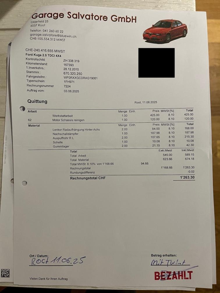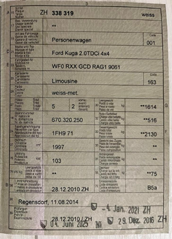 Eintauschfahrzeug Ford Kuga 2.0TDCi 4x4 im Kundenauftrag zu verkaufen (Angaben vom Kunden): Kilometerstand: 176‘000km Letzter Service / MFK: 06.2025 (siehe Prüfungsbescheid im Anhang) Mängel/Defekte/Schäden: Das Auto ist fahrtüchtig und in einem gepflegten Zustand mit altersentsprechender Abnutzung in Innenraum wie auch aussen, Ölwechsel ist fällig Infos zu Bereifung/Felgen: 8-fach Nichtraucherfahrzeug, ab und zu einen Hund mitgeführt Verkauf ab Platz, ohne Gewähr und ohne Garantie