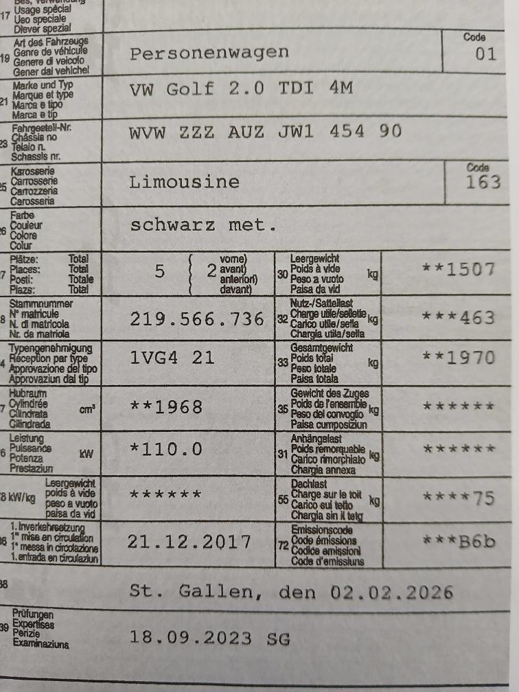 Technisch nicht geprüft. Fahrzeug läuft und kann gefahren werden. Warnlampen leuchten Keine. Hat 1 Schlüssel und Serviceheft ist nicht komplett. Hat auf dem Dach einen Hagelschaden (siehe Bilder) Auf der Haube nur vereinzelt. Dieselfilter erfolgreich getestet. Hat Winterräder mit sehr gutem Profil und Sommerräder. Zustand von aussen und innen gut. Kleinere Kratzer auf der Carosserie sonst gut. Fahrzeug MUSS innert 7 Tage abgeholt werden. (Banküberweisung)