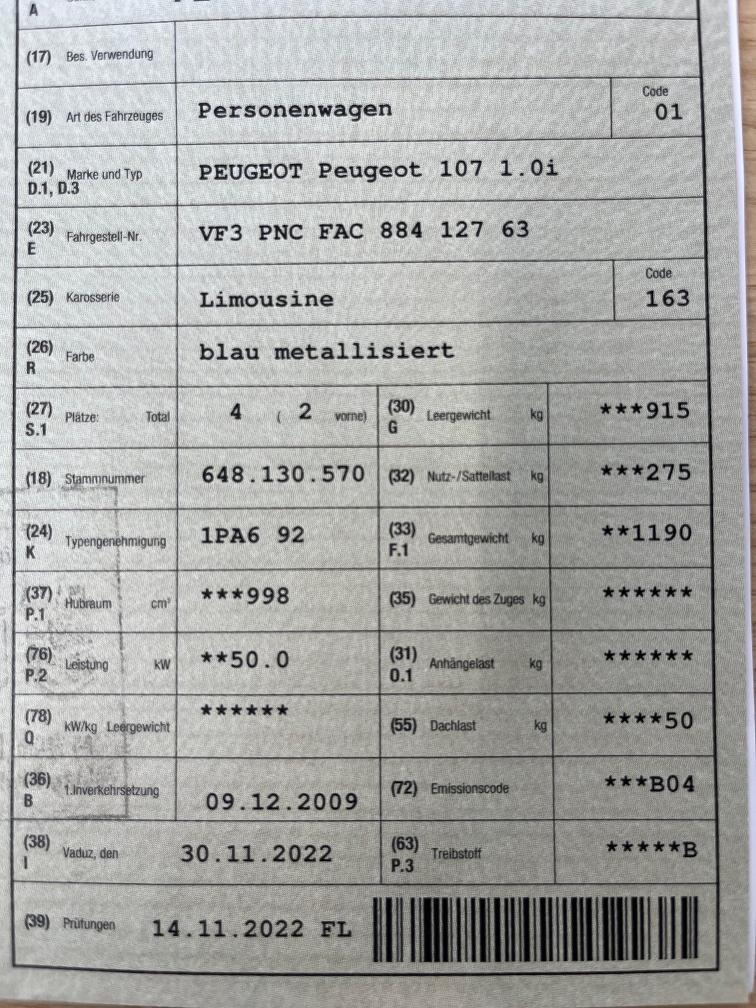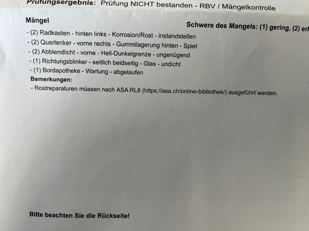 Der Peugeot hat die MfK nicht bestanden. Mängelliste der MfK siehe Foto. Zustand gemäss Fotos. Kein Werkstatttest durchgeführt. Für sichtbare und nicht sichtbare Mängel wird nicht gehaftet. Keine Minderung und Wandelung möglich. Keine Nachverhandlungen. Das Fahrzeug muss innerhalb von 7 Tagen nach Zuschlag abgeholt werden und bar bezahlt werden.