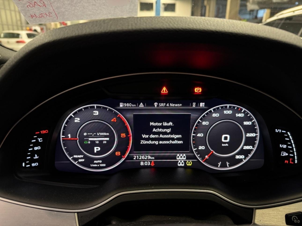 Wegfahrsperre elektronisch, Xenon-plus, Paket: Glanzpaket, Airbag: Airbag Fahrer und Beifahrer, Räder: Reifenreparatur-Set (Tire Fit), Allradantrieb permanent, Media: Digitaler Radioempfang (DAB), Scheibenwischer vorne mit Intervall, Multifunktions-Lederlenkrad 4-Speichen mit Schaltwippen, Dachspoiler, Bremsenergie-Rückgewinnung, Mittelkonsole mit Ablagefach, Garantie: 2 Jahre ohne Kilometerbegrenzung (ab 1. Inv.), Laderaumabdeckung faltbar und herausnehmbar, Cupholder, Wärmeschutzverglasung, Seitenairbag für Fahrer und Beifahrer, Sitze: Normalsitze, Dachreling Alu-Look, 12-Volt-Steckdose vorne, Modellbezeichnungen (Logo & Model), Fahrwerk: Dynamisches Fahrwerk, Elektrische Kindersicherung, Warndreieck, Audi pre sense basic, Kindersicherung im Fahrgastraum, Alu-Räder 8Jx18 5-Arm-Design, Start-/Stop-Knopf, Automat Tiptronic, Stopp-/Start-System, Licht: Drittes Bremslicht, Licht: LED Heckleuchten, Rücksitzlehne geteilt abklappbar, Audi drive select, Heckscheibenheizung, Airbag: Window-Kopfairbags, Sicherheitslenksäule, Ablagefach, Airbag: Airbag Beifahrer deaktivierbar, Getönte Scheiben, Teppichfussmatten vorne und hinten, Lichtpaket, Polster: Stoff-Ausstattung, Assist: Bremsassistent (BAS), Verbandskasten, Notrufsystem, Heckklappe elektrisch, ISOFIX-Befestigungspunkte für Kindersitz an den äusseren Rücksitzen, Media: Bluetooth-Schnittstelle, Assist: Einparkhilfe plus, Fahrer-Informationssystem mit Farbdisplay, Servolenkung geschwindigkeitsabhängig, Radschrauben mit Diebstahlsicherung, 3-Punkt-Sicherheitsgurte auf allen Plätzen, Partikelfilter und Oxydationskatalysator, Licht: Nebelschlussleuchte, Zentralverriegelung mit Fernbedienung, Räder: Reifendruck-Kontrollanzeige, Anfahrassistent, Mittelarmlehne vorn in Kunstleder schwarz mit Kontrastnaht in Rot, Gurtkontrolle, Digital Uhr, Elektronisches Stabilitäts-Programm (ESP), Innenspiegel automatisch abblendbar, Klima: 2-Zonen-Klimaautomatik, Media: MMI Radio plus, Tempomat mit Geschwindigkeitsbegrenzer, Getriebe: 8-Stufen-Automat sequentiell, Dachhimmel, Höhenverstellbare Gurten vorne, Elektronische Parkbremse, Kindersitzvorrichtung ISOFIX Beifahrerseite, Raucherpaket, Aussenspiegel rechts und links beheizt-, elektrisch verstell- / und einklappbar mit Bodenbeleuchtung, auf Fahrerseite automatisch abblendend, Heckscheiben-Wisch-/Waschanlage, Licht: Licht- und Regensensor, Einstiegsschienen verchromt, Sonnenblende Fahrer und Beifahrerseite mit beleuchtetem Spiegel, Media: Audi Sound System, Dekoreinlagen Eloxallack anthrazit, oben Diamanntlack silbergau, ABS, EBD elektronische Bremskraftverteilung, Lackierung: Uni-Lackierung, Lenkrad: Lenkrad längs- und höhenverstellbar, Klima: Pollenfilter (Staubfilter), KEYLESS GO