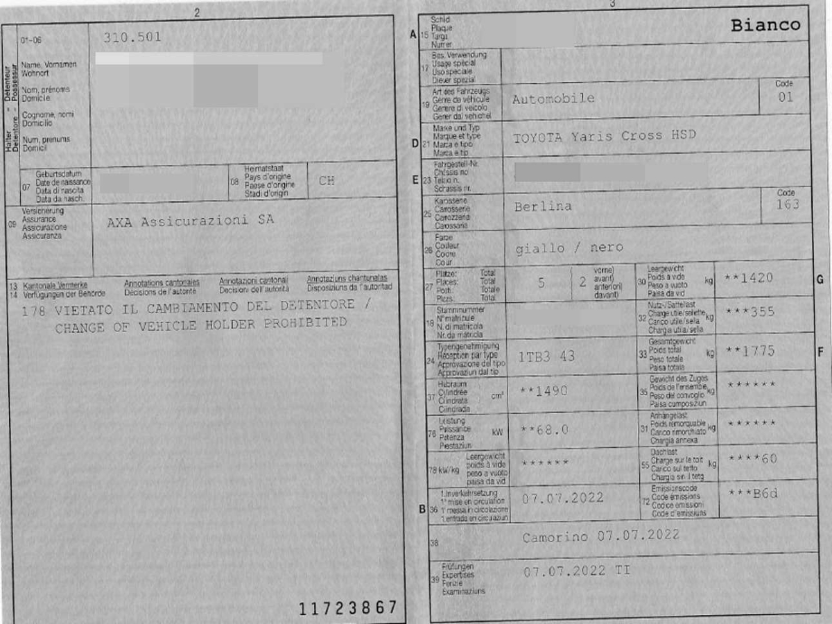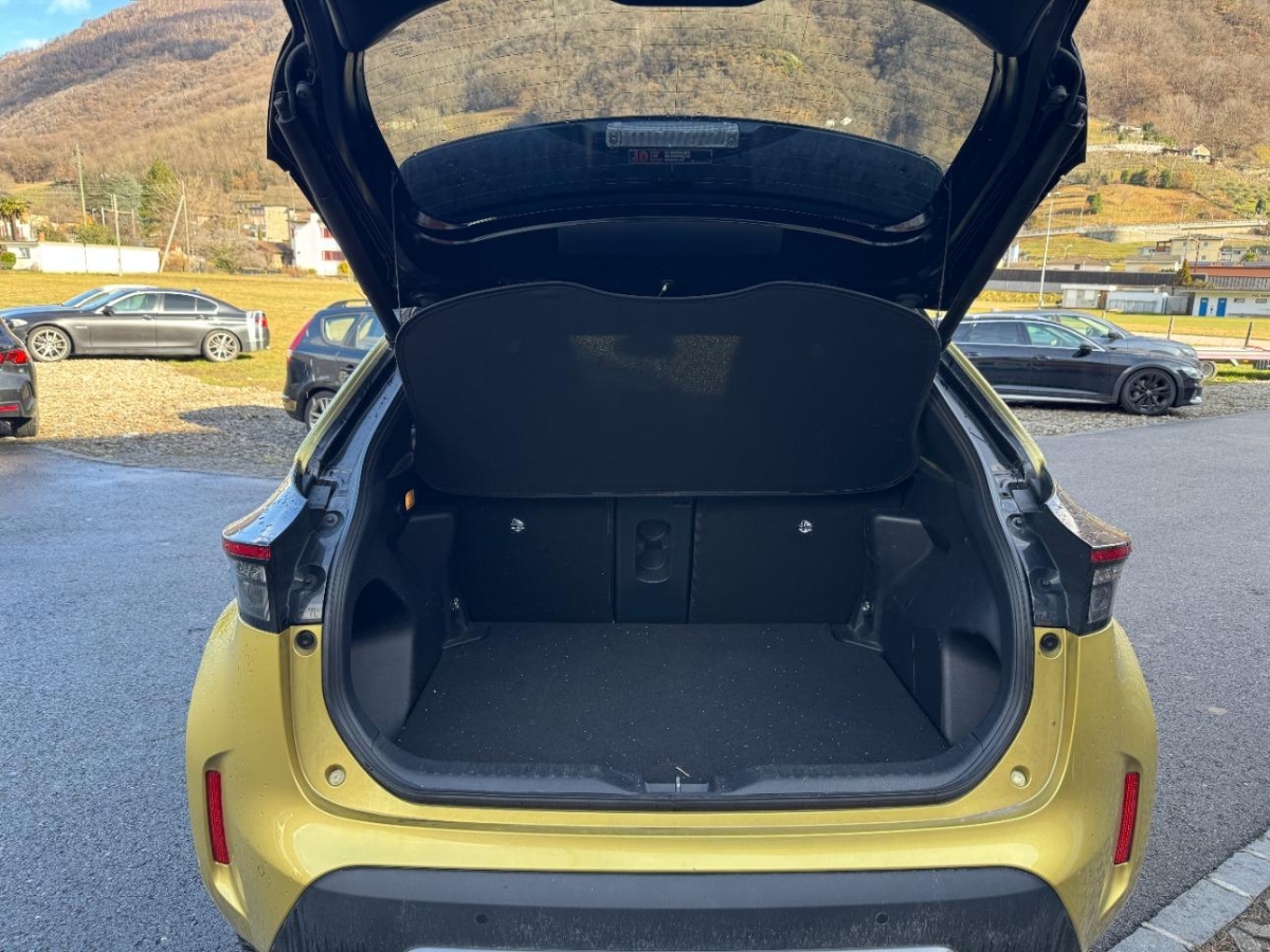 ISOFIX Kindersitzvorrichtung, Heckscheiben-Wisch-/Waschanlage, Kickdown-Funktion, Schalthebelknauf in Leder, Licht: LED Nebelscheinwerfer, Zentralverriegelung mit Fernbedienung, Elektrische Fensterheber vorne + hinten mit Komfortschliessung, Lackierung: Bi-Tone Metallic-Farbe mit schwarzem Dach, Airbag: Kopfairbags vorne und hinten, Räder: Reifenreparatur-Set, Sitze: Beifahrersitz 6 -fach manuell verstellbar, Klima: Ferngesteuerte Klima via MyT-App, 12V-Anschluss, Sitze: Fahrersitz manuell verstellbar, 3-Punkt-Sicherheitsgurte auf allen Plätzen, Fahrwerk: Integrierter Fahrmodus-Wählschalter, Scheibenwischerauflage beheizt, Türverkleidung Filz vorne und hinten, Armaturen und Türen softtouch, Scheibenbremsen 16", 12 Volt-Steckdose im Laderaum, Digital-Tacho, Frontgrill in Piano Black mit Verzierungen in Chrom, Elektronische Stabilitätskontrolle (S-VSC), Sitze: Sportsitze, Media: USB-Anschluss, Airbag: Mittel Airbag zwischen Fahrer und Beifahrer, Airbag: Airbag Fahrer und Beifahrer, Assist: Spurverfolgungsassistent (LTA) mit Spurverlasswarner (LDA) und aktiver Lenkunterstützung, Dekor: Dekorelemente piano black, Dachreling, Licht: LED-Scheinwerfer mit adaptivem Fernlicht-Assistent (AHS), Sitze: Beifahrersitz höhenverstellbar, Heckscheibe und hintere Seitenscheiben getönt, ABS mit Bremsassistent BA, Haifisch-Antenne AM/FM, Kühlergrill schwarz, Media: Telefon Freisprechanlage, Sitze: Kopfstützen vorne und hinten, Start-/Stop-Automatik, Sonnenblende Fahrer und Beifahrerseite mit beleuchtetem Spiegel, Assist: Akustisches Einparksystem vorne/hinten, Assist: Rückfahrkamera, Licht: LED Heckleuchten, Airbag: Seitenairbag für Fahrer und Beifahrer, Freisprecheinrichtung, Media: Toyota Touch Infotainment mit 8" Bildschirm und Smartphone Integration, DAB+, Innenspiegel automatisch abblendbar, Assist: Pre Collision System mit Fussgänger- und Fahrraderkennung (PCS), Licht: Drittes Bremslicht, Garantie: Toyota Hybrid Garantie 5 Jahre auf Hybridkomponenten oder 100 000 km, Lenkrad: Lederlenkrad, Media: DAB+ (Digital Audio Broadcasting), B-Säulen schwarz, Heckscheibenheizung, Assist: Berganfahrhilfe (Hill Assist Control - HAC), Dekor: Türverkleidung vorne und hinten mit Filz, Türgriffe aussen in Wagenfarbe, Assist: Adaptiver Tempomat ACC, Getränkehalter vorne, 2x Mittelkonsole, Räder: 18"-Leichtmetallfelgen, 215/50-R18-Reifen lackiert, Dekor: Interieurornamente Soft-Touch schwarz, Sitze: Fahrersitz höhenverstellbar, Handschuhfach, Licht: Scheinwerfer mit Follow me home Funktion, Lenkrad: Lenkrad längs- und höhenverstellbar, Regensensor, Scheiben dunkel getönt ab B-Säule, Assist: Geschwindigkeitsbegrenzer, Assist: Notlfall Lenkassistent, Getränkehalter, 2x hinten, Licht: Fernlichtautomatik, Multiinformationsdisplay 7", Sitze: Fahrersitz mit Lendenwirbelstütze (elektrisch einstellbar), Front- und heckstosstange im robousten Design, Doppelter Kofferraumboden, E-Call, Armaturenbrett: Grau, Dekor: Dekorlinie in Gold, Mittelarmlehne vorne, Polster: Teilleder, Lenkrad: Lenkradbedienung für Audio und Tempomat, Assist: Verkehrsschild-Erkennungssystem, Ablagetaschen Rückseite des Beifahrersitzes, Garantie: 3 Jahre/100 000 km - Lackgarantie 3 Jahre/Kilometer unbegrenzt - Duchrostungsgarantie 12 Jahre/Kilometer unbegrenzt, Media: Hochauflösendes Navigationssystem Toyota "Go" inkl. 3 Jahren kostenloses Kartenupdate, Räder: Reifendruckkontrollsystem, Dachhimmel schwarz, Dachspoiler in Wagenfarbe, Klima: 2-Zonen-Klimaautomatik, Licht: Nebelschlussleuchte, Servolenkung, Wegfahrsperre elektronisch, Media: 6 Lautsprecher, Elektrische Handbremse, Unteres Armaturenbrett schwarz