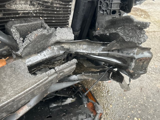 Front eingedrückt. Frontblech/Maskenblech eingedrückt. Längsträger vorne rechts und links gestaucht.