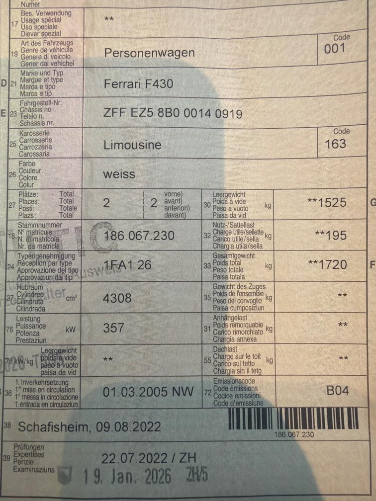 12 Monate Garantie über Quality möglich für einen Aufpreis von SFr. 1’900.- (Schadenlimite SFr. 12’000.-) Das Fahrzeug ist frisch ab MFK & Service (Ferrari) Fahrzeug ist in einem sehr schönem Zustand (Innen wie Aussen) !!! Fahrzeug kann jederzeit bei uns vor Ort begutachtet und Probegefahren werden. Daytona-Streifen sind geklebt. Preisvorstellung: SFr 82’500.- Fahrzeug für Händler, läuft sauber. Am Fahrzeug wurde kein Werkstatttest gemacht (Für sichtbare oder nicht sichtbare Mängel wird nicht gehaftet). Wir testen & kontrollieren nicht alle Funktionen vom Fahrzeug. Das Risiko liegt somit vollumfänglich beim Käufer. Fahrzeug kann gegen Voranmeldung besichtigt werden. Nachdem der Höchstbietende den Zuschlag erhalten hat, gibt es keine Nachverhandlung, auch wenn nicht deklarierte Mängel zum Vorschein kommen sollten. Ab Platz ohne Garantie, Wandelung und Minderung werden wegbedungen.