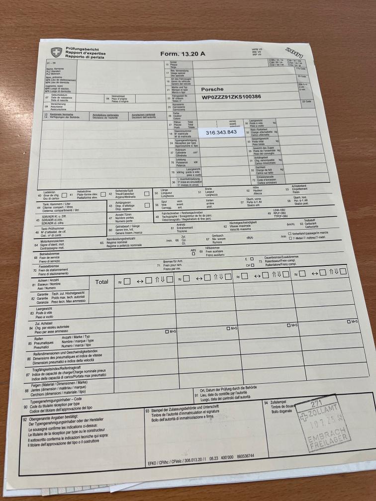 Das Fahrzeug wurde im Juli 2025 aus Deutschland Importiert, 13.20 vorhanden. Da es sich um Umzugsgut handelt, kann der 911er frühestens im Juli 2026 nach bestandener MFK Prüfung auf ein Schweizer Schild eingelöst werden. Batterie ist def. muss ersetzt werden. Sonst läuft und fährt er problemlos, wir haben aber keine weiteren technischen Prüfungen beim Fahrzeug gemacht. Fz. wird ab Platz ohne Garantie oder jegliche Nachwährschaft verkauft.