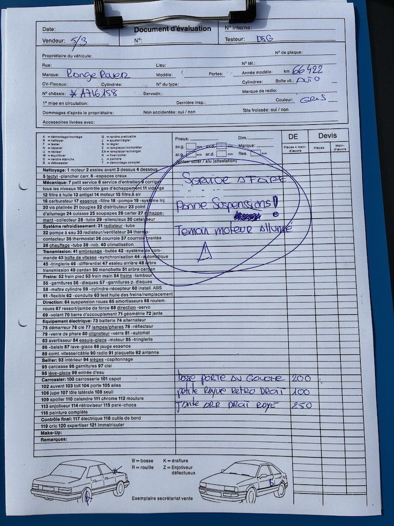 service a faire panne suspension ( devis 3 000 CHF chez Land Rover ) témoin moteur allumé bosse porte AVG ( 200 CHF ) petite rayure retro droit ( 100 CHF ) jantes ARD rayé ( 250 CHF ) Motor Getriebe Vorderachse Hinterachse Airbags ausgelöst: 0 Nein ( Abfallcode 16.01.04ak )