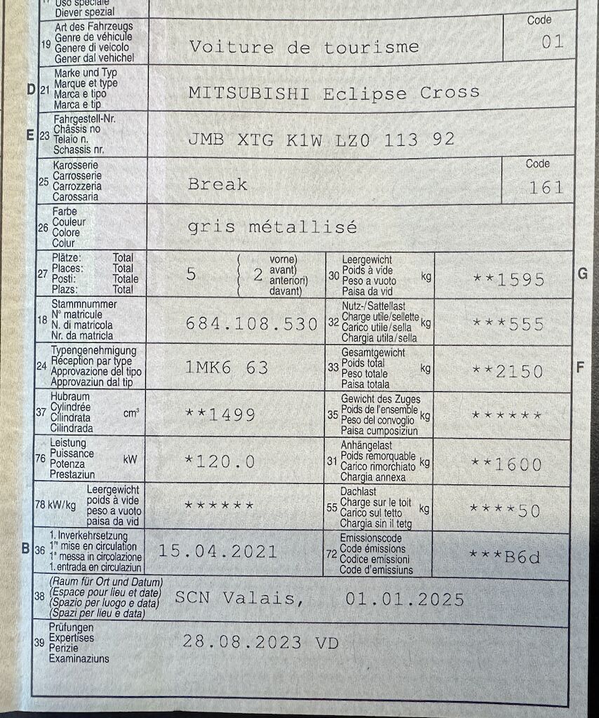 Pas de contrôle technique (essai en atelier) effectué Huit pneus. Motor Getriebe Vorderachse Hinterachse Airbags ausgelöst: 0 Nein ( Abfallcode 16.01.04ak )