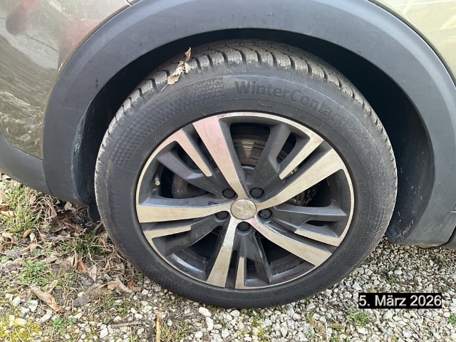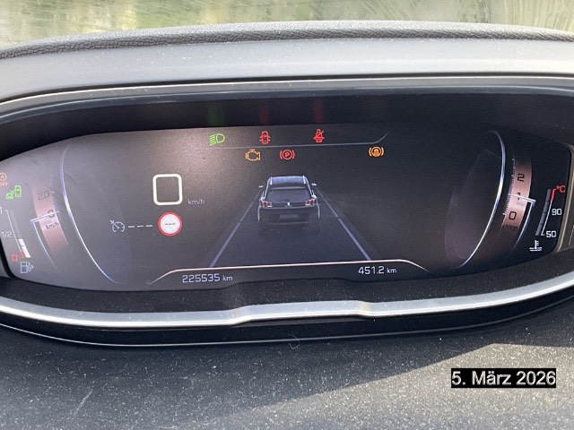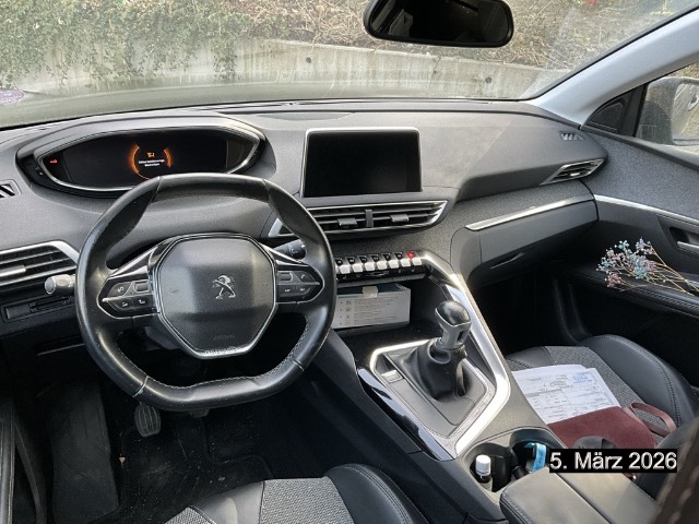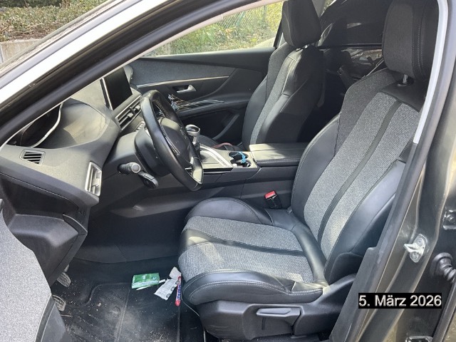 Drehzahlmesser, Gurtkontrolle, Bremsassistent (BAS), Digital Uhr, Bordcomputer, Licht: LED-Tagfahrlicht, Höhenverstellbare Gurten vorne, Park Distance Control vorne und hinten, Automatisches Einschalten der Abblendlichter, Airbag: Fahrer und Beifahrer, Gangempfehlung, Regensensor für Scheibenwischer vorne, Head-Up Display, Assist: Verkehrsschild-Erkennungssystem, Media: USB-Anschluss, Navigationssystem mit Sprachsteuerung Peugeot Connect SOS und Assistance, Aussenspiegel rechts und links beheizbar und elektrisch verstellbar, Elektronische Parkbremse, Airbag: Window-Kopfairbags, Dynamische Traktionskontrolle (DTC), Audio MP3-Player, Assist: Spurhalteassistent Lane Assist, Wassertemperaturanzeige, Elektronisches Stabilitäts-Programm (ESP), Kopfstützen vorne höhenverstellbar, Assist: Active Safety Brake, Getriebe: 6-Gang-Getriebe, Radiovorbereitung, Antenne, Entstörung und 6 LS, Zierleisten aussen in Chrom, Katalysator geregelt, Kühlergrill verchromt, Wartungsintervall-Anzeige, 3-Punkt-Sicherheitsgurte auf allen Plätzen, Gurtstraffer vorne, Stopp-/Start-System, Zentralverriegelung mit Fernbedienung, Media: Touchscreen, Assist: Spurhalteassistent,Fernlichtassistent,Verkehrsschilderkennung und Geschwindigkeitsempfehlung, Assist: ABS, EBD, elektronische Bremskraftverteilung, Steckdose 12V, 3x, Klima: 2-Zonen-Klimaautomatik, Sitze: Beifahrersitz höhenverstellbar, Toter-Winkel-Warnsystem, Bluetooth Freisprecheinrichtung, Servolenkung geschwindigkeitsabhängig, Beide Make up-Spiegel beleuchtet, Kindersicherung an den hinteren Türen, Mirror Screen, Aussenspiegel elektrisch anklappbar, ISOFIX Kindersitzvorrichtung, Elektrische Fensterheber vorne + hinten, Licht: Drittes Bremslicht, Ambientebeleuchtung, Tempomat mit Geschwindigkeitsbegrenzer, Fahrersitz mit Lordosenstütze, Berganfahrhilfe, Sitze: Fahrersitz höhenverstellbar, LED Innenlichtpaket, Antennen-Diversity, Handschuhfach, Pollenfilter (Staubfilter), Heckscheibenheizung, Räder: Reifendruck-Kontrollanzeige, Licht: Nebelscheinwerfer, Umfeldbeobachtung Front-Assist, Coming-home-Funktion, Aussenspiegel in Wagenfarbe, Beifahrersitz mit Klapptisch, Aussentemperaturanzeige, Radio, Naturlederlenkrad, Wegfahrsperre elektronisch, Airbag: Seitenairbag für Fahrer und Beifahrer, Abgedunkelte Seiten- und Heckscheibe, Seitenschwellerschutz, Türgriffe aussen in Wagenfarbe, Antriebsschlupfregelung (ASR), Ladeboden variabel, Räder: Leichtmetallfelgen Detroit 18J, Polster: Stoff-/Kunstleder-Ausstattung, Dachreling in Aluminium, Innenspiegel abblendbar
