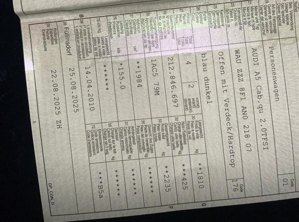 Eintauschfahrzeug ohne Kontrolle. Gemäss Vorbesitzer erhöhter Ölverbauch - bekanntes Problem bei diesen Motoren. Keine Kontrolle durch uns durchgeführt. Wandelung/Minderung ausgeschlossen. Abholung innert fünf Arbeitstagen.