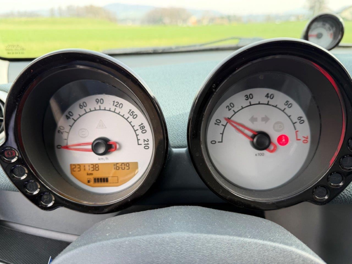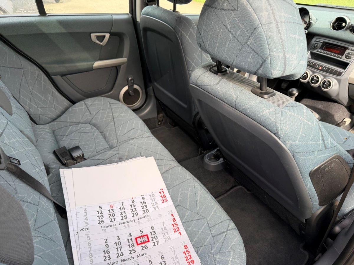 5-Gang-Getriebe, Rücksitzlehne geteilt abklappbar, Reifenreparatur-Set mit Kompressor, Rücksitze längsverstellbar, Einstiegsschienen, Handschuhfach, Wegfahrsperre elektronisch, Servolenkung, Nebelscheinwerfer, Zentralverriegelung mit Fernbedienung, Elektrische Fensterheber vorne, Licht: Nebelschlussleuchte, Lenkrad höhenverstellbar, Steckdose, 4 Leichtmetallfelgen 15J mit Pneu, Antiblockiersystem (ABS), Kühlergrill in Silber, Panorama-Glasdach, Scheibenwischer vorne mit Intervall, Getönte Scheiben, Elektronisches Stabilitäts-Programm (ESP), Seitenairbags, Airbag: Airbag Fahrer und Beifahrer, Fahrersitz höhenverstellbar, Kopfstützen hinten, Cupholder vorne, Drittes Bremslicht, Klimatisierungsautomatik, 3-Punkt-Sicherheitsgurte auf allen Plätzen, Gurtstraffer vorne, Katalysator geregelt, Bremsassistent (BAS), Lenkrad und Schalthebelgriff in Leder, Aussentemperaturanzeige, Sicherheitszelle in Silber