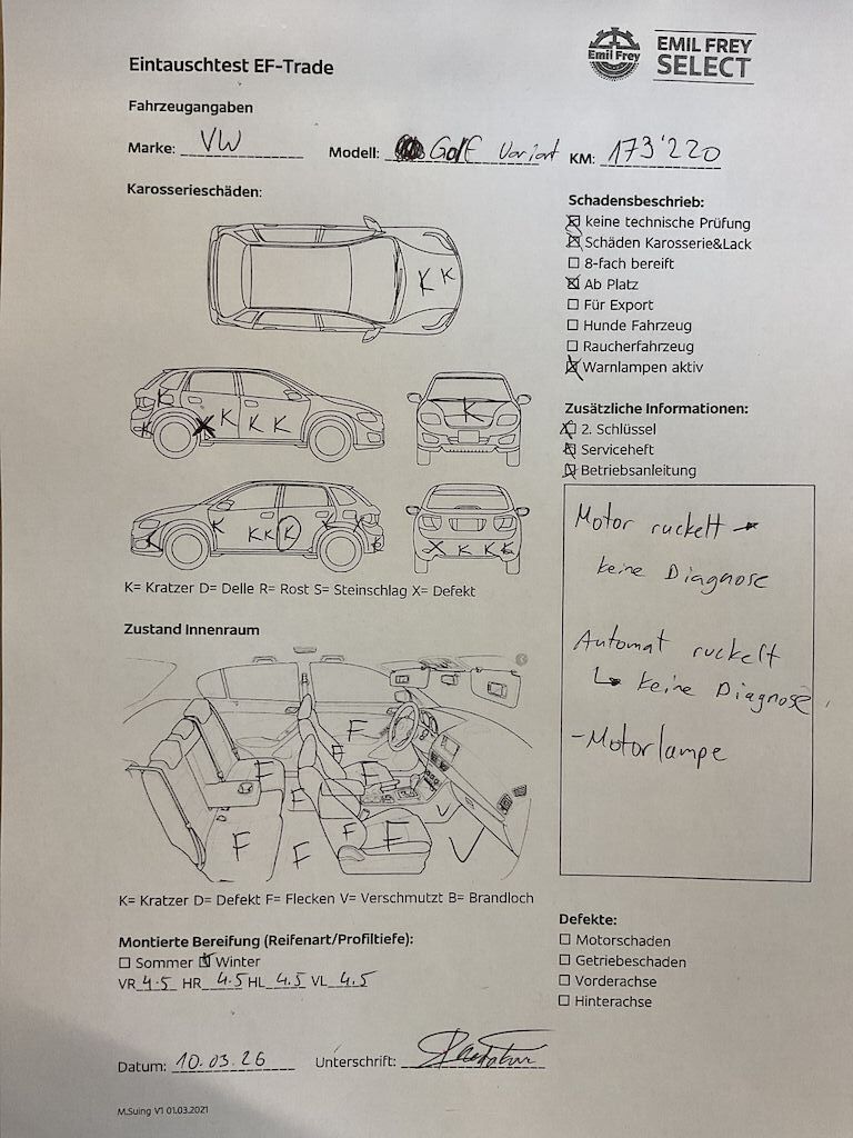 Keine technische Prüfung (Werkstatttest) vorgenommen Diverse Schäden an Karosserie/Lack. Fahrzeug ab Platz, ohne Garantie und Aufbereitung. DPF/FAP Filter nicht kontrolliert Motor ruckelt —> keine Diagnose Automat ruckelt —> keine Diagnose Motor Getriebe Vorderachse Hinterachse Airbags ausgelöst: 0 Nein ( Abfallcode 16.01.04ak )