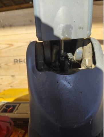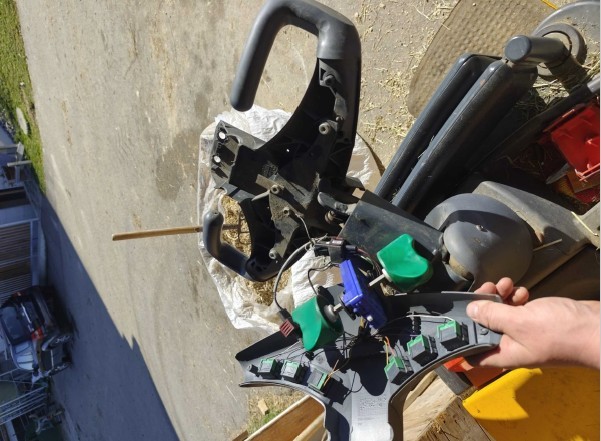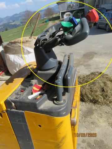 Elektro-Deichselstapler mit 2000 kg Hubkraft Deichsel mit Handteil deformiert Not-Schalter, Kunststoff-Abdeckung oben gebrochen