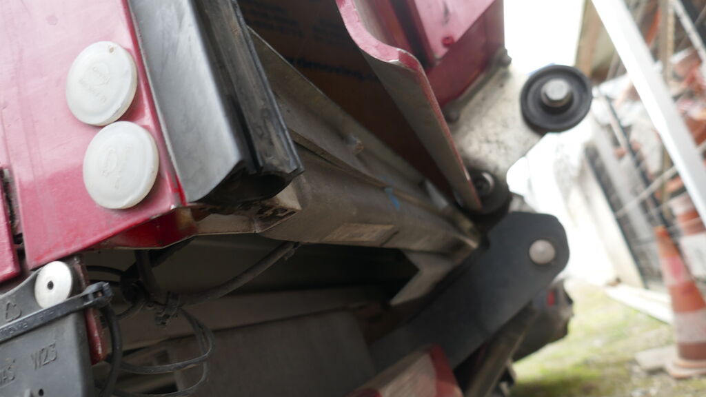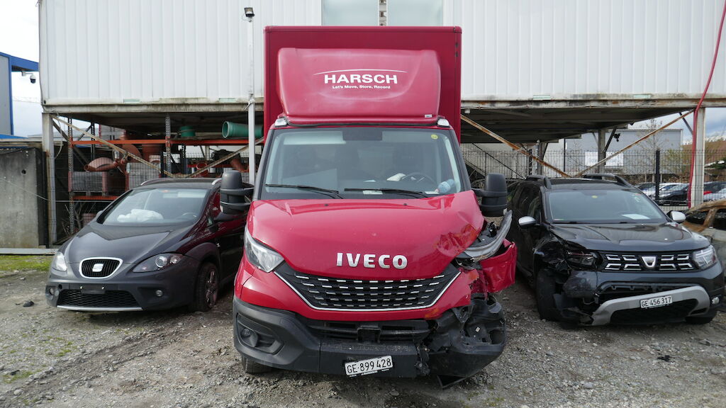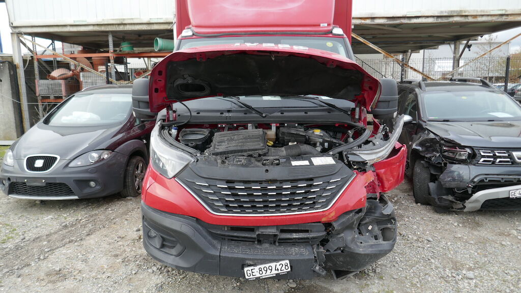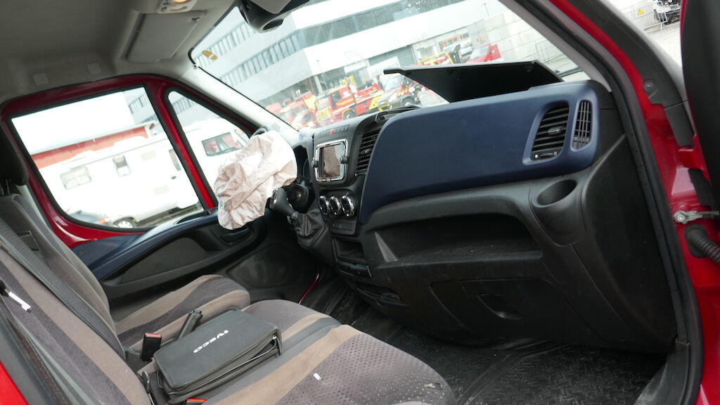 Violent choc avant gauche : pare-chocs avant gauche et central, supports, guides, calandre, cache de calandre, phare avant gauche, capot, charnière gauche de capot, serrure de capot, aile avant gauche, porte avant gauche, tablier, renfort de tablier, joue d'aile avant gauche, montant A avant gauche, montant B arrière gauche, radiateur, condenseur, traverse inférieur, fermeture de longeron avant gauche, masque, filtre à air, support de boite à fusible enfoncés, déformés, éraflés, contraints, brisés. Caisse de transport complétement décalée, partiellement arrachée du faux châssis, faux châssis endommagé. Traverse arrière de la caisse déformée arrachée. Airbag conducteur et ceinture conducteur déployés, tirés. Risque sur longeron. Motor Getriebe Vorderachse Hinterachse Airbags ausgelöst: 1 unbekannt ( Abfallcode 16.01.04ak )