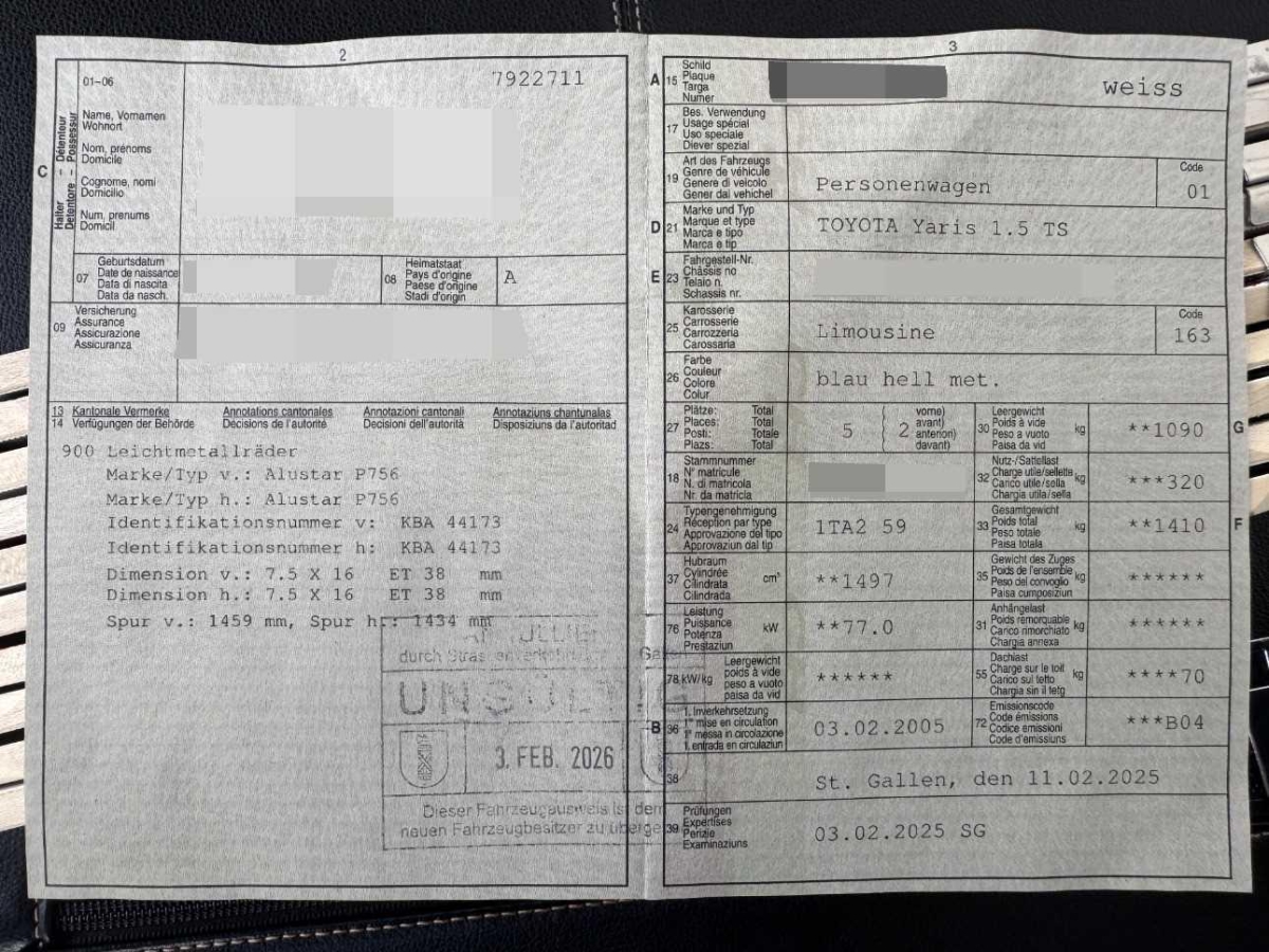 Gurtstraffer vorne, Heck- und Frontspoiler, Räder: 4 Leichtmetallfelgen 15J mit Pneu, Leseleuchten vorne, Lenkrad: Lenkrad, Schaltknauf und Handbremshebel Leder, Getriebe: 5-Gang-Getriebe, Stabilitäts- und Traktionskontrolle (VSC und TRC), Türgriffe aussen in Wagenfarbe, Drehzahlmesser, Licht: Nebelschlussleuchte, Bremsassistent (BAS), Getönte Scheiben, Notrad, Radiovorbereitung, Antenne, Entstörung und 4 LS, Info-Display, Heckscheibenheizung, Aussentemperaturanzeige, ISOFIX Kindersitzvorrichtung, Seitenaufprall-Schutzsystem, Wassertemperaturanzeige, Scheibenwischer vorne mit Intervall, Sportfahrwerk, Pollenfilter (Staubfilter), Sitze: Sportsitze vorne, Rücksitze längsverstellbar, Laderaumabdeckung, Antiblockiersystem (ABS), Zentralverriegelung mit Fernbedienung, Polster: Stoff-Ausstattung, Schublade unter Beifahrersitz, Wegfahrsperre elektronisch, Elektrische Fensterheber vorne, Radio/CD mit Lenkradfernbedienung, Tankdeckel-Entriegelung von innen, Stossstangen und Aussenspiegel in Wagenfarbe, Katalysator geregelt, Lichtwarnsummer, Leuchtweitenregulierung von innen, Lenkrad: Lenkrad höhenverstellbar, Airbag: Airbag Fahrer und Beifahrer, Sitze: Rücksitzlehne geteilt abklappbar, Servolenkung geschwindigkeitsabhängig, Licht: Nebelscheinwerfer, Digital Uhr, Handschuhfach, Tageskilometerzähler, Höhenverstellbare Gurten vorne, Aussenspiegel rechts und links beheizbar und elektrisch verstellbar, 3 Kopfstützen hinten, Licht: Drittes Bremslicht, Sitze: Fahrersitz höhenverstellbar, Cupholder vorne und hinten, Heckscheiben-Wisch-/Waschanlage