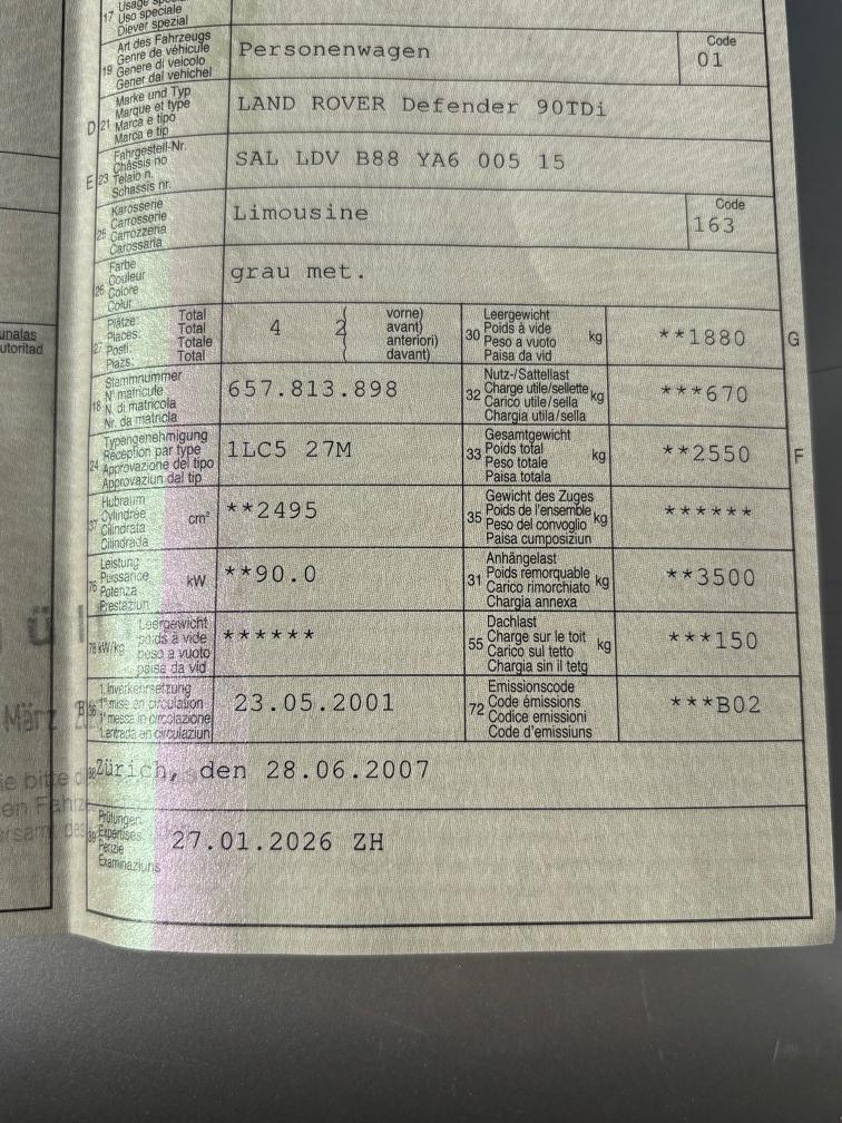 Defender frisch ab MFK (27.01.2026) Für die MFK wurde sehr viel gemacht, unter Anderem: - beide Bremszangen, -scheiben und -beläge vorne ersetzt - diverse Bremsleitungen ersetzt - Spurstangengelenke - Stossdämpfer-Dom vorne rechts ersetzt - Wischergestänge, etc. Fahrzeug ist stark schmutzig (lief im Forstbetrieb) und hat diverse Beulen und Kratzer! Über Bodenwellen hört man ein schlagendes Geräusch (wie eine Stabilisatorstrebe). Ansonsten ist das Fahrzeug problemlos fahrbar und bereit für Hobby oder Arbeitsalltag. Der Landy verfügt über 3500kg Anhängelast und hat Kugel- und Hakenkupplung. Eingetragen sind 4 Sitzplätze, weitere Sitze gibt es dazu (war mal ein 6 Plätzer). Arbeitsscheinwerfer am Heck oben über separaten Schalter. Jede Gewährleistung, soweit nach Gesetz möglich, wird wegbedungen, insbesondere sind Wandelung und Minderung ausgeschlossen.