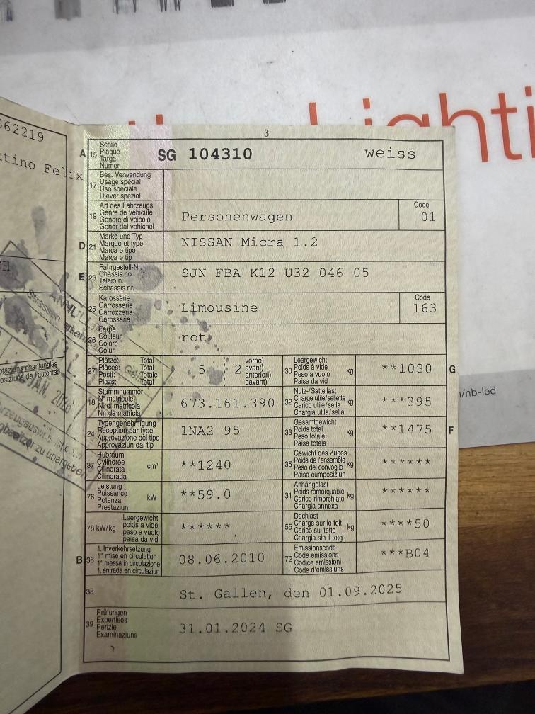 Motor und Getriebe Laufen perfekt! - Kupplung ersetzt vor 7000 km - grosser Service 9.24 - Winterpneu neuwertig - Bremsen neuwertig - 2x Funkschlüssel - AUX Anschluss Bekannte Mängel - div. Schäden aussen (siehe Fotos) - Ölverlust - Motorlampe (Auto fährt ohne Probleme) - Batterie muss ersetzt werden - Scheibenwischer geht nicht - Rost an einem der Hebepunkte Gebrauchtes Fahrzeug kann diverse Kratzer und Beulen aufweisen. Fahrzeugbereifung und Ausstattung gemäss Foto. Keine mechanische Prüfung, Fahrzeugkauf auf eigenes Risiko ab Platz ohne Nachwährschaft. Die Gewährleistung für Sachmängel wird wegbedungen. Muss nach Zuschlag innert 5 Tagen bezahlt und abgeholt werden.