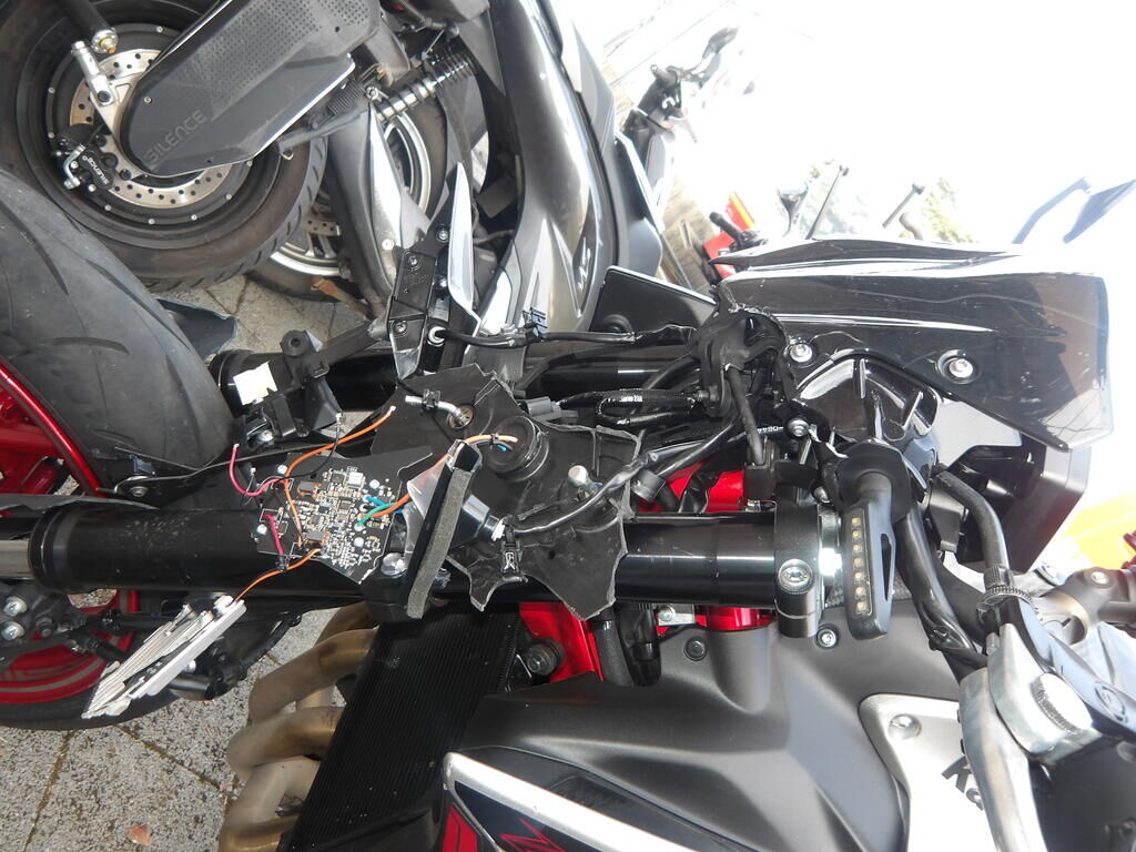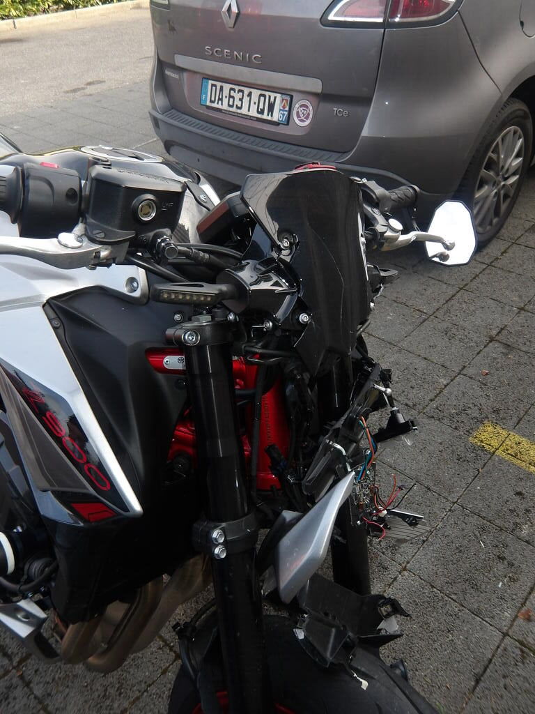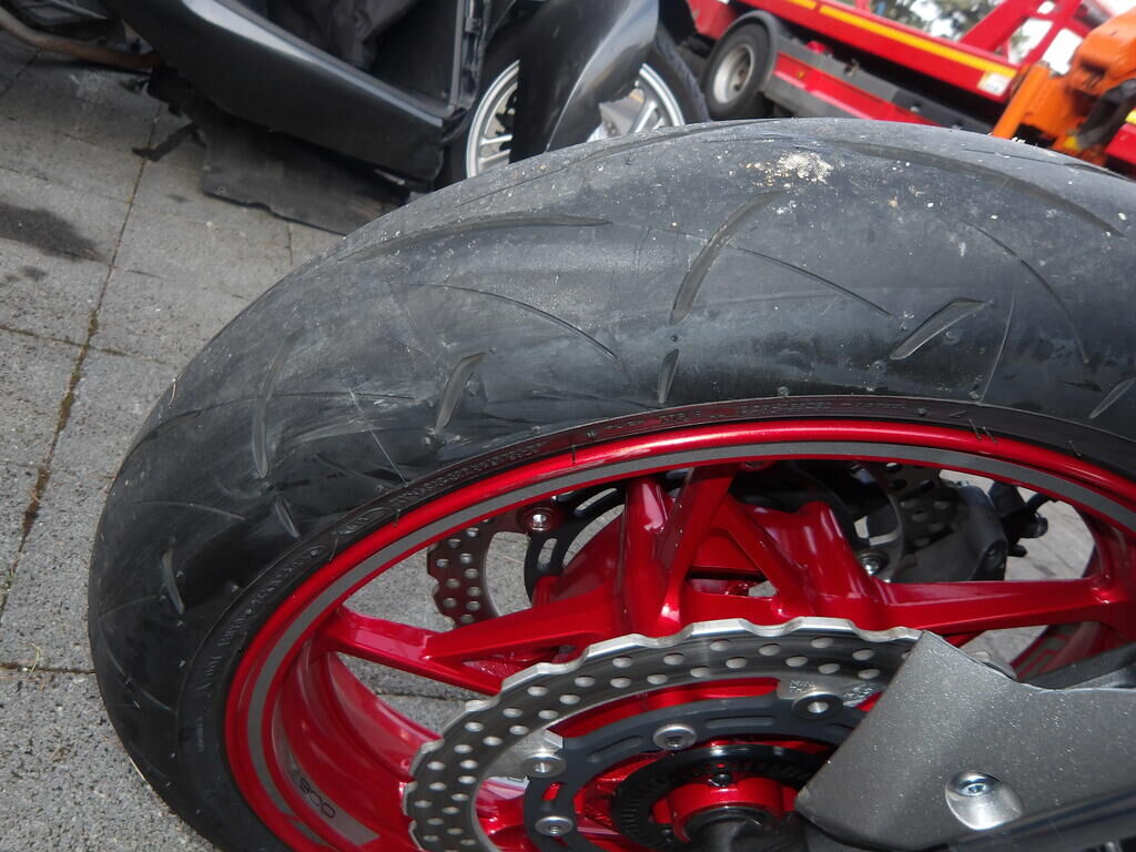 toute la partie avant est endommagée et perte de liquide venant du moteur, carénages, feu, fourche, garde-boue, jante avant, radiateur de refroidissement moteur, une bosse sur le réservoir Motor Getriebe Vorderachse Hinterachse Airbags ausgelöst: 0 Nein ( Abfallcode 16.01.04ak )