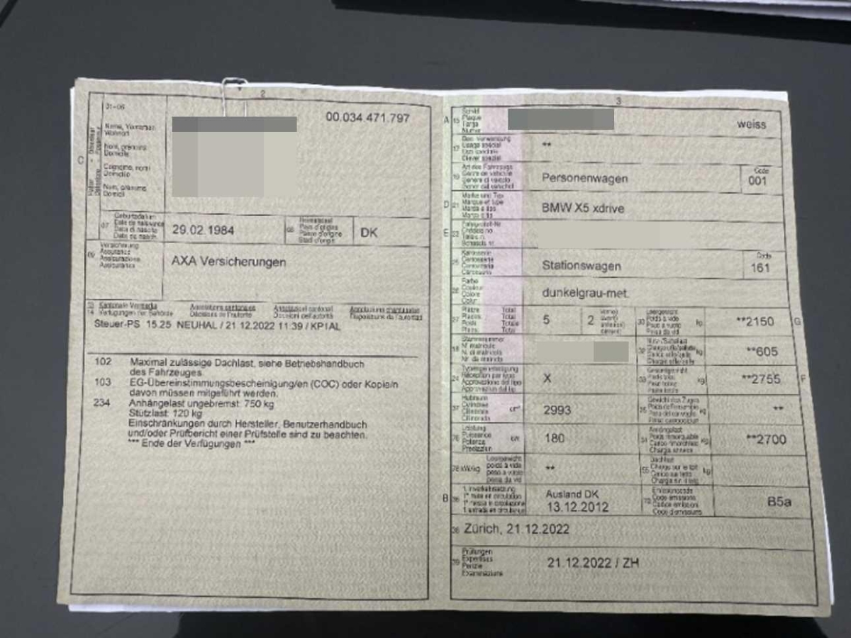 3 Kopfstützen hinten, Leichtmetallfelgen im Sternspeiche 209 18J mit Pneu, Geteilte Heckklappe, Scheibenwischer vorne mit Intervall, Drittes Bremslicht, Lenkrad: Lenkrad längs- und höhenverstellbar, Assist: Anfahrassistent, Dynamische Stabilitätskontrolle (DSC), Airbag: Airbag Fahrer und Beifahrer, Klimatisierungsautomatik, Allradantrieb permanent, Grün getönte Scheiben, Tagfahrlicht, Verbandskasten, Abschliessbare Radschrauben, Regensensor für Scheibenwischer vorne, Mittelarmlehne vorne, Aussenspiegel rechts und links beheizbar und elektrisch verstellbar, Partikelfilter und Oxydationskatalysator, Servotronic, Heckscheiben-Wisch-/Waschanlage, Aussentemperaturanzeige, Stossstangen und Aussenspiegel in Wagenfarbe, 3 Speichen-Lederlenkrad, 2 Steckdosen in der Mittelkonsole (vorne und hinten), Getriebe: 8-Stufen-Automat Steptronic, Bordcomputer, Tageskilometerzähler, Wartungsintervall-Anzeige, Dynamische Bremsleuchten, Anbauteile in Wagenfarbe, Assist: Cornering Brake Control (CBC), Armlehne vorne mit Ablagefach, Rücksitzlehne geteilt abklappbar, Dekor: Interieurleisten in Satinsilber matt, Lackierung: Uni-Lackierung, Gepäckraumboden abschliessbar, Sicherheitstrennnetz oder /-gitter im Gepäckraum, Start-/Stop-Knopf, Assist: Tempomat mit Bremsfunktion, Lenkrad: Multifunktionslenkrad, Stoff-Ausstattung, Radio BMW Professional, Nichtraucherausführung, Automatische Stabilitäts-Control (ASC), Window-Kopfairbags, Lichtwarnsummer, Elektronische Parkbremse, Bremsassistent (BAS), Stereolautsprechersystem mit 6 LS, Airbag: Airbag Beifahrer deaktivierbar, Hill Descent Control (HDC), Sitzbelegungserkennung für Beifahrersitz, Elektrische Fensterheber vorne + hinten, Bremsbelag-Verschleissanzeige, Steckdose im Kofferraum, Vordersitze mit elektrischer Höhen-, Lehnen-, und Neigungseinstellung, Licht: Nebelschlussleuchte, Zentralverriegelung mit Fernbedienung, ISOFIX Kindersitzvorrichtung, Mittelarmlehne hinten, Innen- und Aussenspiegel automatisch abblendend, Laderaumabdeckung, Veloursfussmatten vorne und hinten, Park Distance Control vorne und hinten, Aufklappbare Heckscheibe, Info-Display, Wegfahrsperre elektronisch, Gurtstraffer vorne, Antiblockiersystem (ABS), Frontscheibe Verbundglas, Cupholder vorne und hinten, Vordersitze mechanisch längsverstellbar, Airbag: Seitenairbag für Fahrer und Beifahrer, Aktive Kopfstützen, Befestigungsösen im Laderaum, Bremsenergie-Rückgewinnung, Höhenverstellbare Gurten vorne, Assist: Crash-Sensor, Reifen mit Notlaufeigenschaft, Aux-In Anschluss, Nebelscheinwerfer, Reifendruckverlust-Warnsystem