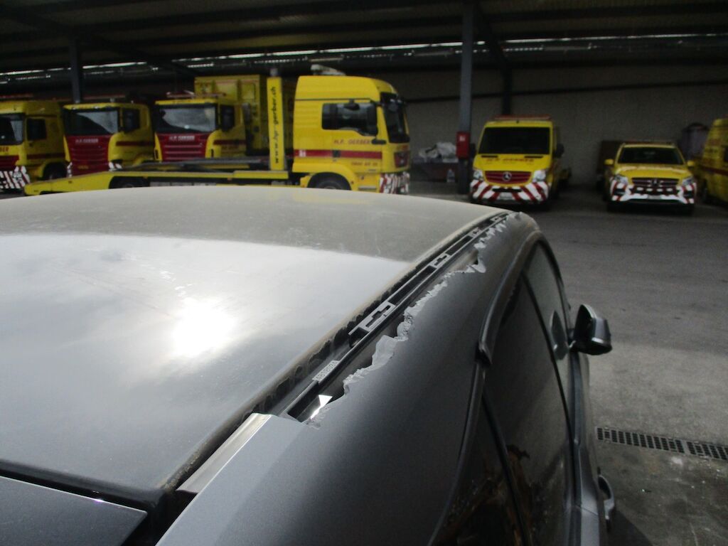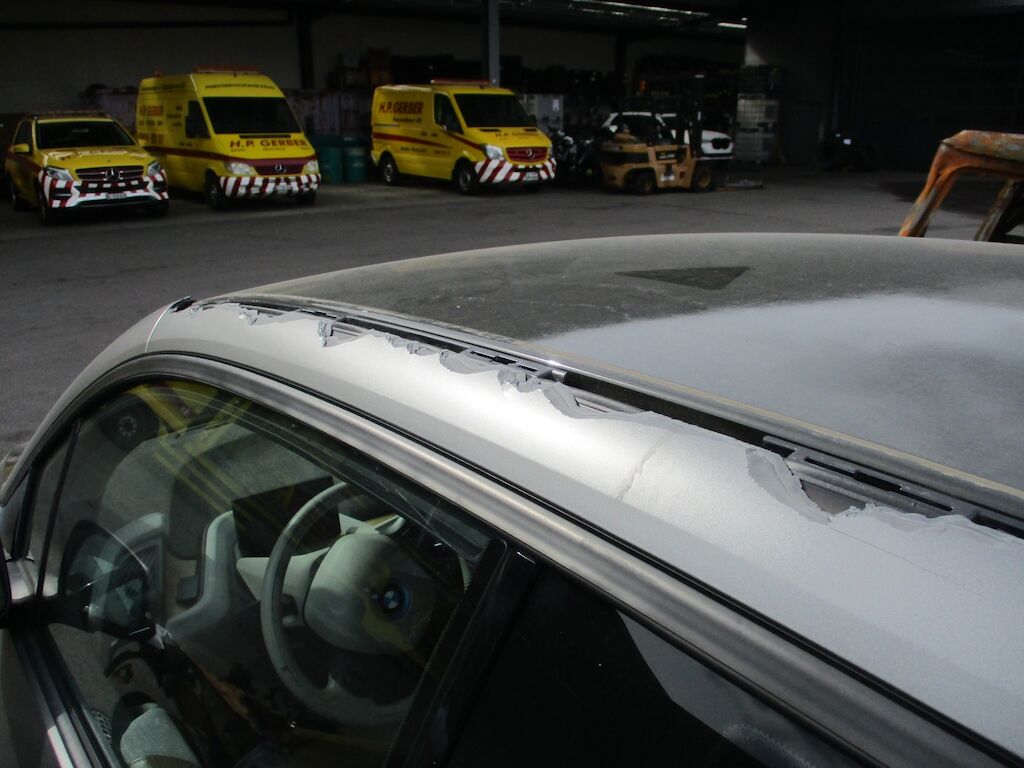 Das Auto weist Schäden an der Front und an den Dachrahmen auf Die Frontscheibe ist zertrümmert Die Stossstange ist eingedrückt. Beide rechten Räder sind zerstört. Die Türe und die Seitenwand HR sind angeschürft. Motor Getriebe Vorderachse Hinterachse Airbags ausgelöst: 0 unbekannt ( Abfallcode 16.01.04ak )