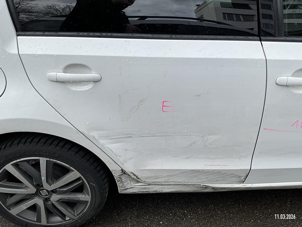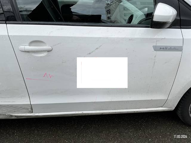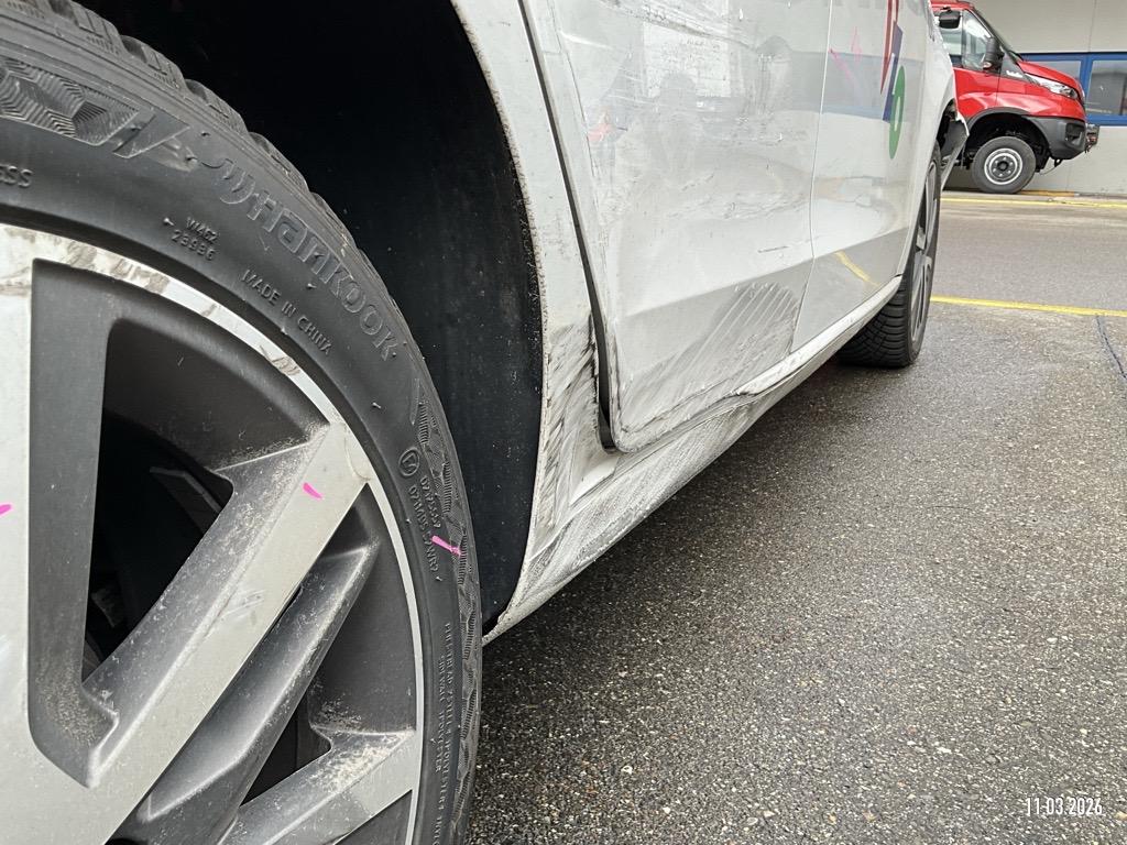 Seite rechts : Stossfänger vorne gerissen, Scheinwerfer zerschlagen, Motorhaube eingedrückt, Kotflügel geknickt, Türe vorne eigedrückt/zerkratzt, Türe hinten eingedrückt/zerkratzt, Schweller eingedrückt/zerkratzt, Felge hinten zerkratzt - AUFZÄHLUNG NICHT ABSCHLIESSEND / Vorschaden: Hagelschaden, Stossfänger hinten links zerkratzt