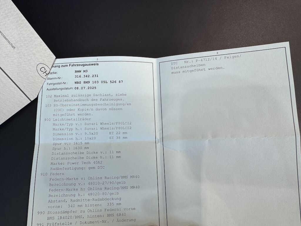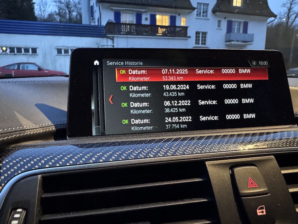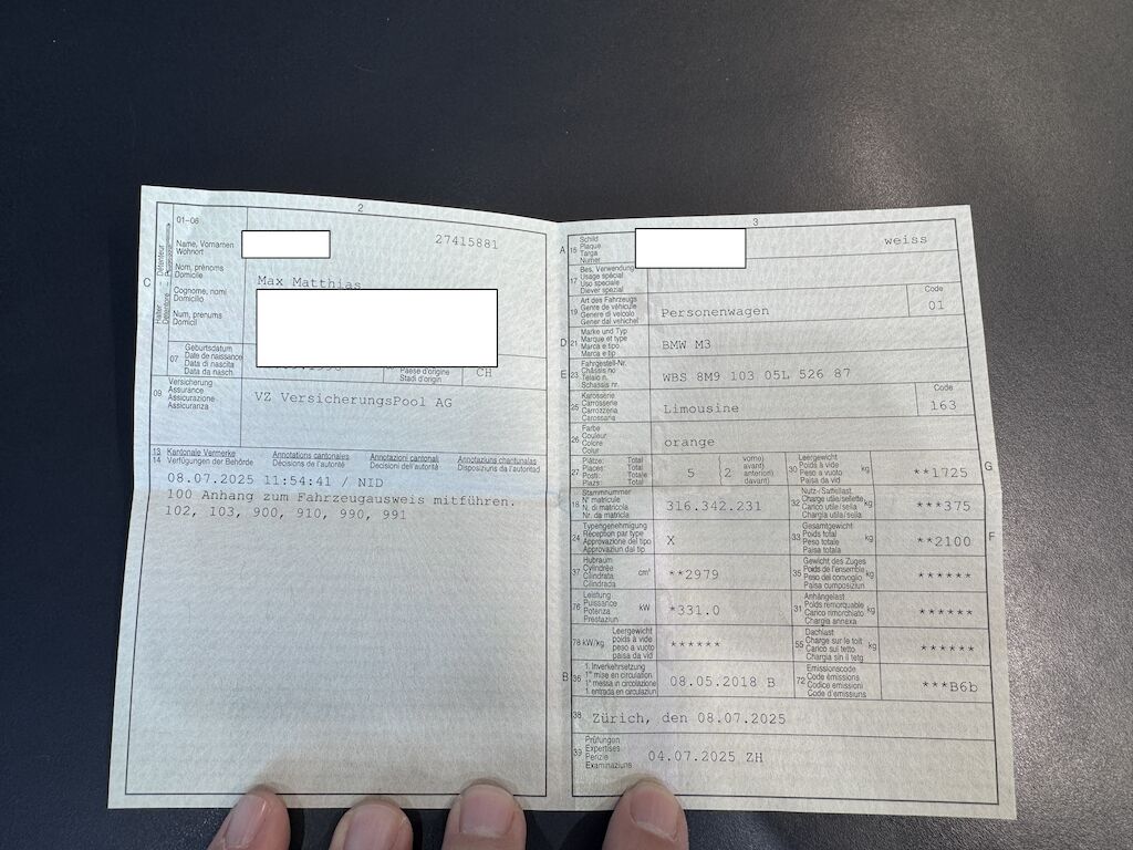 Zustand und Historie:Das Fahrzeug ist lückenlos servicegepflegt und wurde stets mit grösster Sorgfalt behandelt. Trotz zahlreicher Performance-Umbauten ist „Richard“ keineswegs verbastelt – alle Modifikationen wurden ausschliesslich in Fachwerkstätten durchgeführt und sind dokumentiert. Der Gesamtwert der verbauten Komponenten liegt bei rund CHF 30’000 (exkl. Montage).Umbauten Fahrwerk:• Öhlins Racing Gewindefahrwerk (ca. CHF 4’000) [eingetragen]• Leichtmetallräder 9.5 × 20” (v) / 10 × 20” (h) inkl. Distanzscheiben (CHF 4’000) [eingetragen]Umbauten Motor und Abgasanlage:• BMW M Performance Lenkrad & Spiegelkappen (CHF 3’000)• M Performance V2 Titan-Komplettauspuffanlage [BMW Originalteil, sehr selten] (CHF 8’000)• HJS Downpipes mit 300 Zeller-Sportkatalysatoren (CHF 3’800) [Beiblatt]• Crankhub-Fix (CHF 3’450)• Eventuri-Carbon-Ansaugsystem (CHF 3’900) [Beiblatt]• Kennfeldoptimierung durch Bimmer Clinic Schweiz (CHF 2’500)Besonderheiten & Ausstattung• Verkauf 8-fach bereift (1 Satz 18” + 1 Satz 20” mit Distanzscheiben)• Originale Abgasanlage kann auf Wunsch mitgegen werden• Fahrzeugabdeckung und KofferraummatteHerkunft & Nutzung:Der Wagen wurde ursprünglich in Belgien ausgeliefert – ein Vorteil bei Sportwagen. Aufgrund der dort hohen Fahrzeugsteuern werden solche Modelle meist von älteren, wohlhabenden Besitzern gefahren und gepflegt.Der Pflegezustand spricht für sich: Bereits nach 3 km erfolgte der Einfahrservice, der nächste nach nur 2’000 km. Diese Sorgfalt zieht sich konsequent durch die gesamte Fahrzeughistorie.Fazit:Dieser M3 F80 Competition ist kein gewöhnlicher Gebrauchtwagen, sondern ein perfekt abgestimmtes, penibel gepflegtes Liebhaberfahrzeug. Der aufgerufene Preis spiegelt nicht nur den exzellenten technischen und optischen Zustand wider, sondern auch den Wert der fachgerecht installierten Specials.