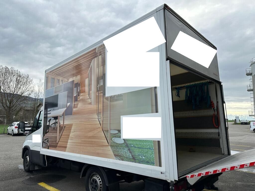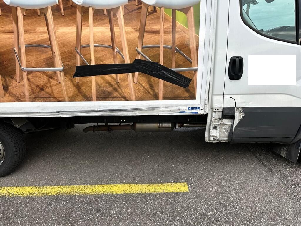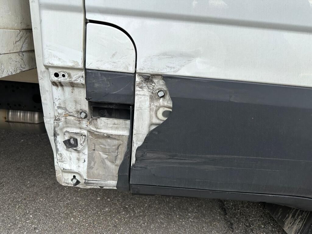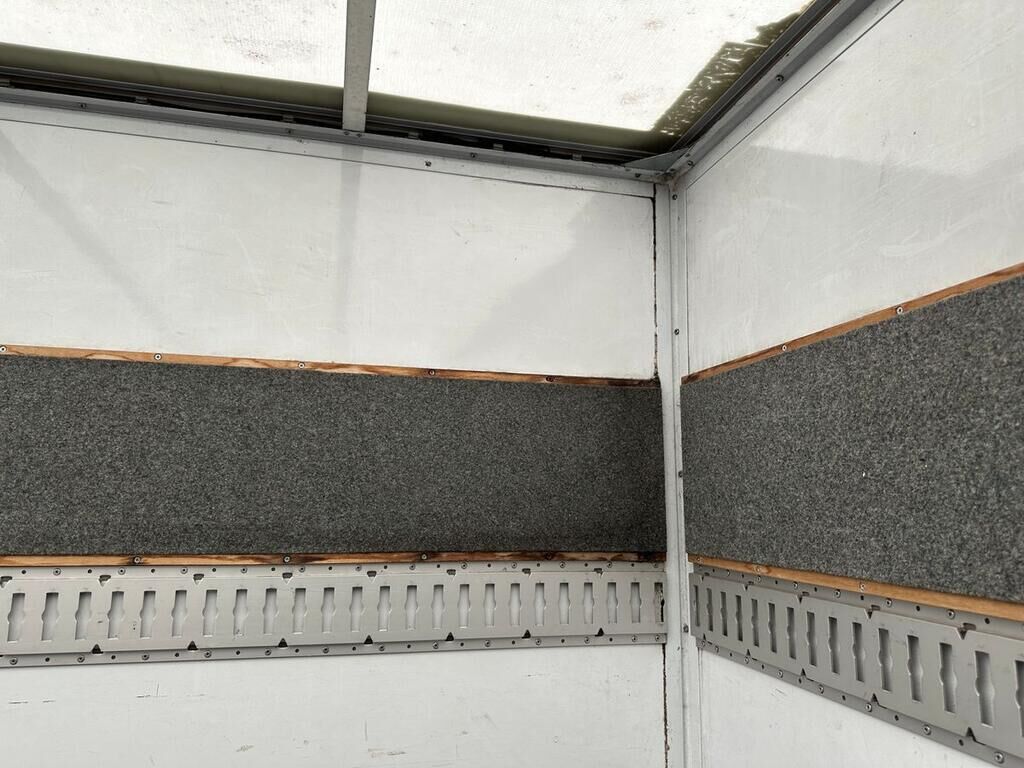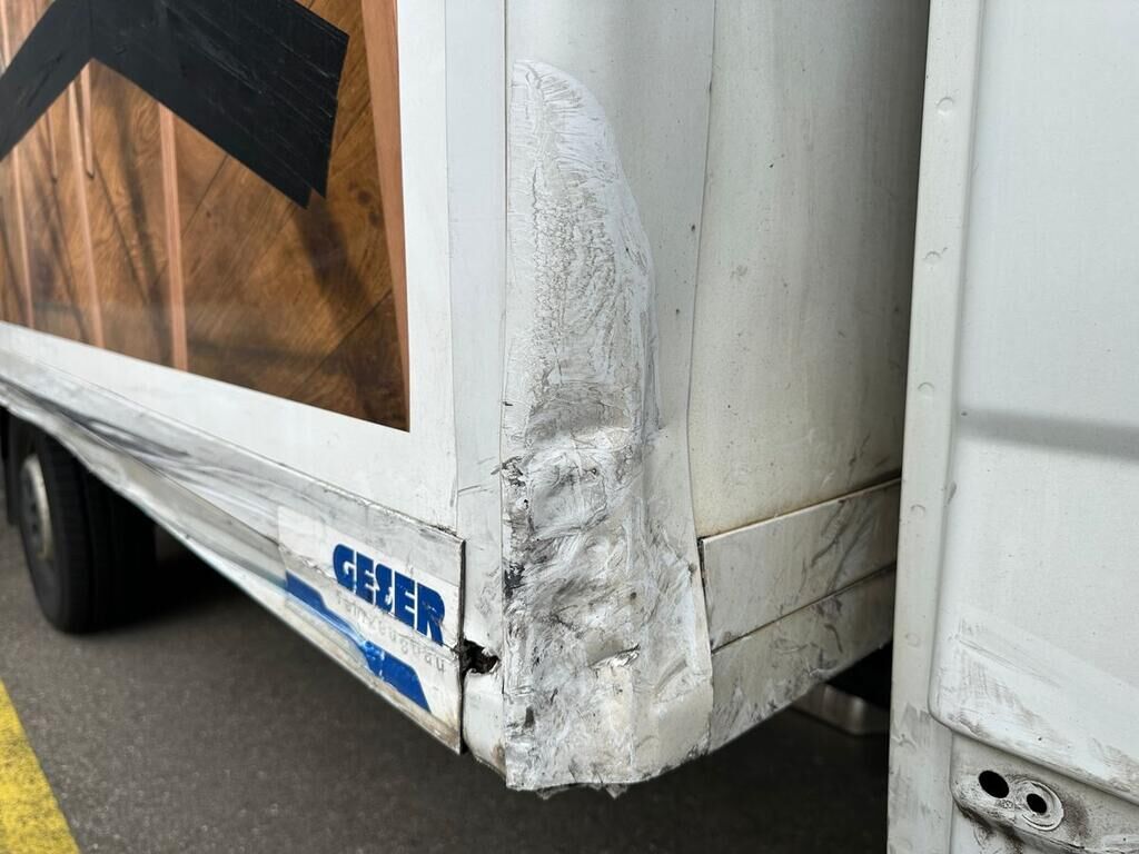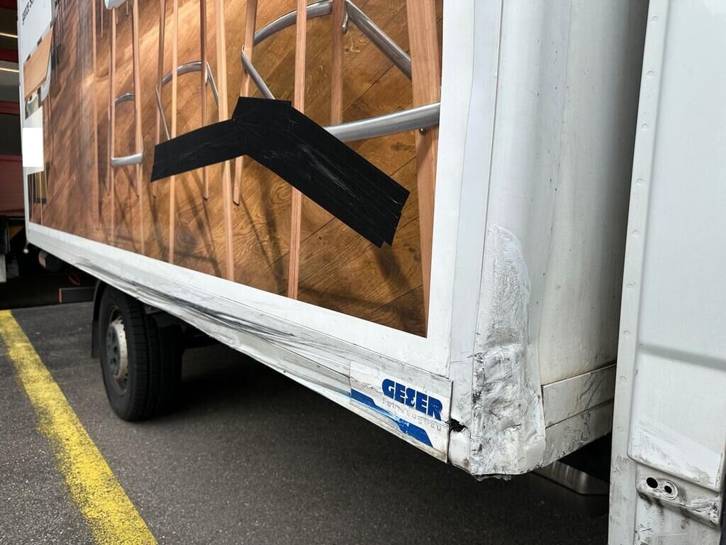 Kofferaufbau, Seitenwand und Türe rechts beschädigt. Motor Getriebe Vorderachse Hinterachse Airbags ausgelöst: 0 unbekannt ( Abfallcode 16.01.04ak )