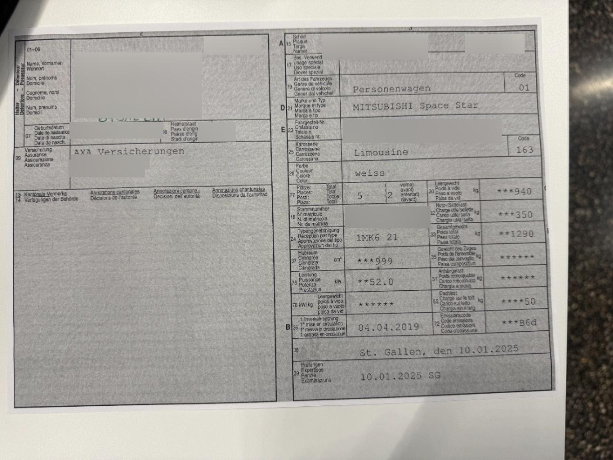 Licht: Halogenscheinwerfer, Getönte Scheiben, Bodenablagefach hinten, Window-Kopfairbags, Licht: Warnblinkautomatik bei Vollbremsung, Assist: Berganfahrhilfe (HAS), Tageskilometerzähler, Radio/CD-Player MP3 mit 4 LS, Innenraumbeleuchtung, Kopfstützen vorne höhenverstellbar, Airbag: Fahrer und Beifahrer, Türgriffe aussen in schwarz, Nebelschlussleuchte, Lackierung: Uni-Lackierung, Radzierblenden, Elektrische Fensterheber vorne, Getränkehalter, 2 vorne, Sitze: Fahrersitz höhenverstellbar, Kindersicherung im Fahrgastraum, Scheibenwischer vorne mit Intervall, TPMS Reifendrucküberwachungssystem, Start/Stop-Funktion, Aussenspiegel in Wagenfarbe, Licht: Drittes Bremslicht, Heckscheibenheizung, Gurtstraffer vorne, Räder: Reifenreparatur-Set (Tire Fit), Wegfahrsperre elektronisch, Zentralverriegelung mit Fernbedienung, Tagfahrlicht, Wassertemperaturanzeige, Make up-Spiegel rechts, Laderaumbeleuchtung, Handschuhfach, Servolenkung, ISOFIX Kindersitzvorrichtung, Cupholder für 3. Sitzreihe, Scheinwerfer-Waschanlage, Media: Digitaler Radioempfang (DAB/DAB+), Polster: Stoff-Ausstattung, Drehzahlmesser, Pollenfilter (Staubfilter), Rücksitze geteilt abklappbar, Sitze: 3 Kopfstützen hinten, Media: USB-Anschluss, Stahlräder 14J, Tankdeckel-Entriegelung von innen, Stabilitäts- und Traktionskontrolle (ASTC), Kühlergrill verchromt, Kopfstützen hinten höhenverstellbar, Katalysator geregelt, Heckklappe mit Scheibenwischer, Digital Uhr, Aussenspiegel elektrisch verstellbar, Akustisches Warnsignal bei nicht angelegtem Sicherheitsgurt, ABS, EBD elektronische Bremskraftverteilung, Seitenairbag für Fahrer und Beifahrer, Fahrer-Informationssystem, Klimaanlage, Bremsassistent (BAS), Lenkrad: Lenkrad höhenverstellbar, Leuchtweitenregulierung automatisch, Getriebe: 5-Gang-Getriebe, Stossstangen in Wagenfarbe