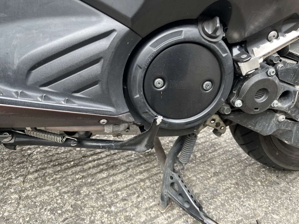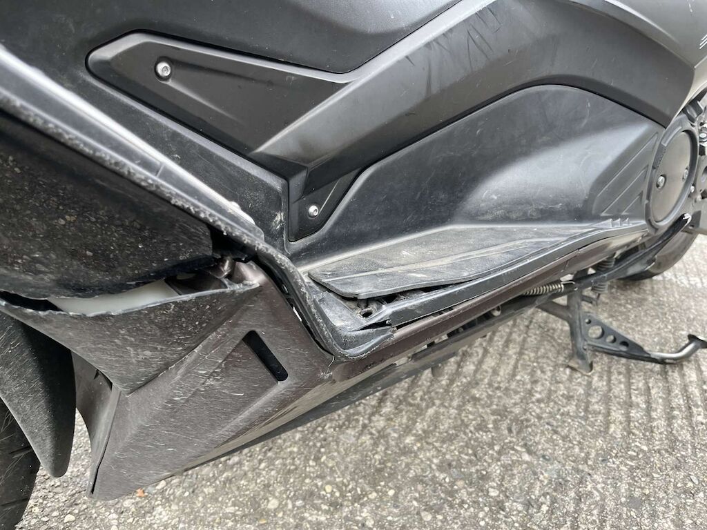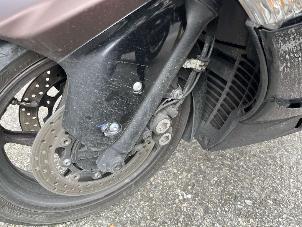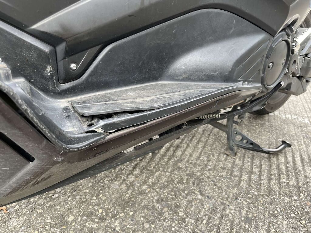 Choc avant et chute côté gauche: Fourche avant, pare-boue, face avant, phare, carénage avant gauche, bas de caisse gauche, repose pied, tablier intérieur, carénage arrière gauche, feux arrière endommagés et cassés. Motor Getriebe Vorderachse Hinterachse Airbags ausgelöst: 0 unbekannt ( Abfallcode 16.01.04ak )