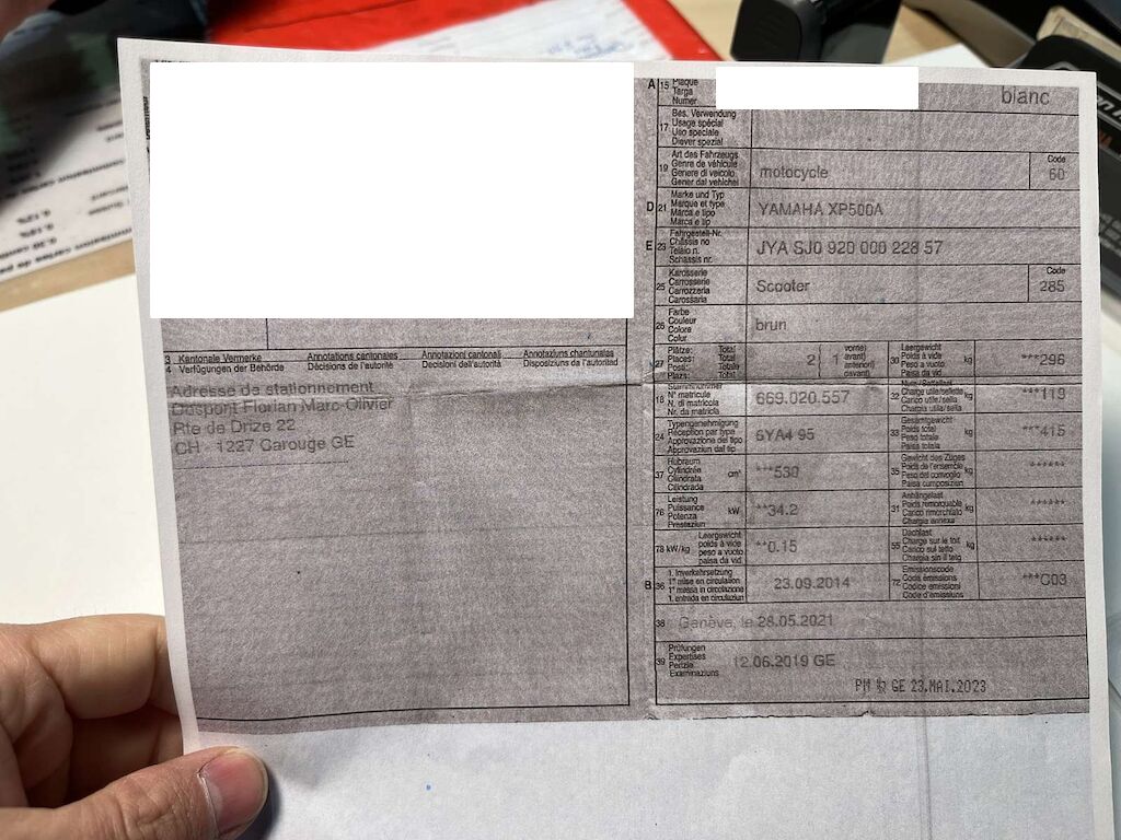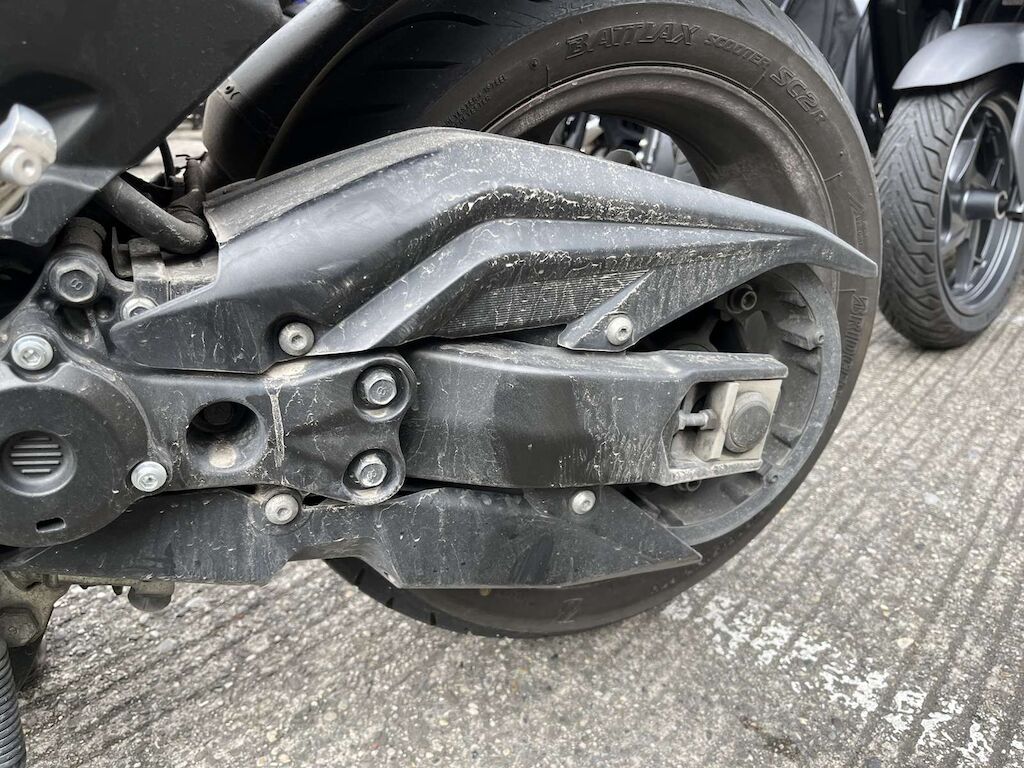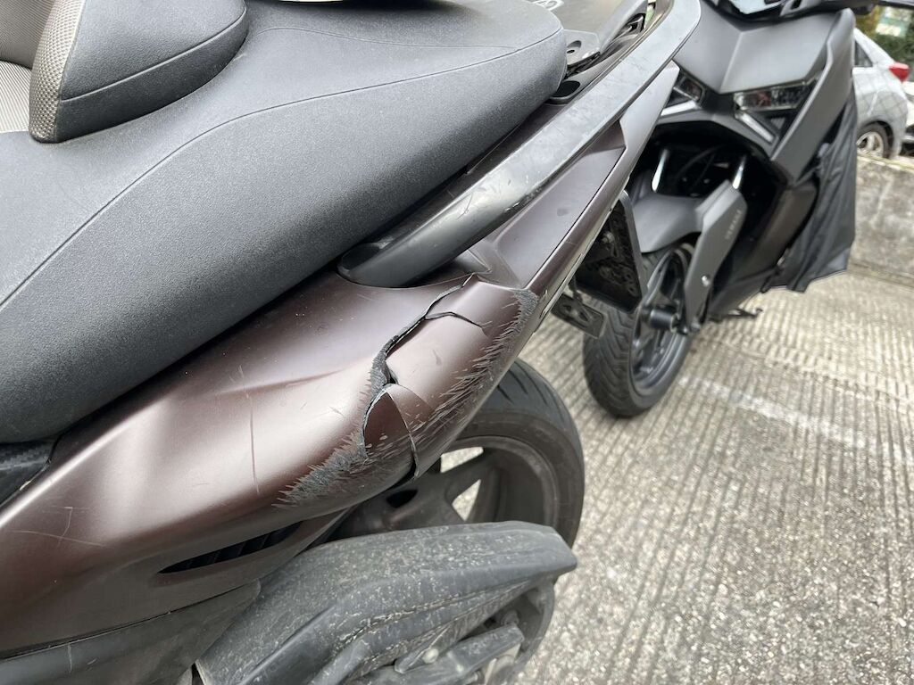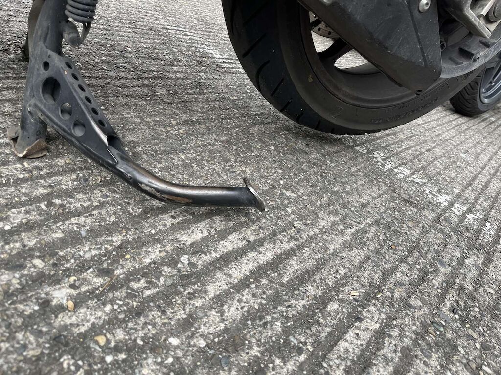 Choc avant et chute côté gauche: Fourche avant, pare-boue, face avant, phare, carénage avant gauche, bas de caisse gauche, repose pied, tablier intérieur, carénage arrière gauche, feux arrière endommagés et cassés. Motor Getriebe Vorderachse Hinterachse Airbags ausgelöst: 0 unbekannt ( Abfallcode 16.01.04ak )