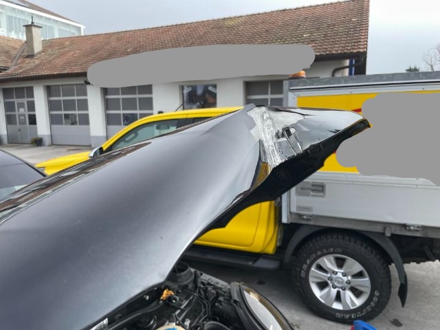 Stossstange vorne, Motorhaube, Kühlergrill, Verstärkung, Scheinwerfer rechts, Kühler, Motor, Vorderseite rechts, Türen rechts, Unterseite rechts und Windschutzscheibe beschädigt.