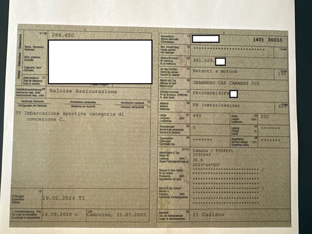 Urto fianco destro (tribordo) e urtolato sinistro (babordo), delaminazione importante della vetroresina dello scafo in vari punti, parabordo danneggiato, altri danni di minore entità riscontrati sul natante (danni vecchi), bolle di osmosi presenti sulla parte inferiore dello scafo. Motor Getriebe Vorderachse Hinterachse Airbags ausgelöst: 0 unbekannt ( Abfallcode 16.01.04ak )