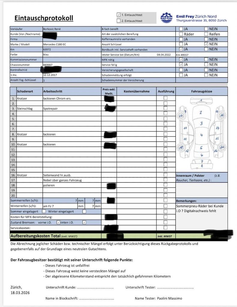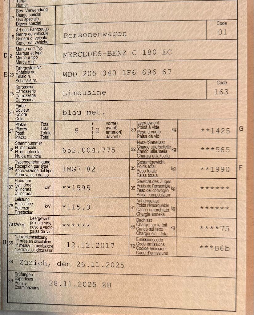 Keine technische Prüfung (Werkstatttest) vorgenommenDiverse Schäden an Karosserie/Lack.8-fach bereift.Fahrzeug ab Platz, ohne Garantie und Aufbereitung.Keine Gewähr auf die Angaben der Sonder- und Serienausstattung / keine mechanische Prüfung. Fahrzeug wurde unzerlegt expertisiert / keine Haftung für allfällige, nach Demontage bekanntwerdenden Mängel. Fahrzeugbereifung und Ausstattung gemäss Fotos / Fahrzeugkauf auf eigenes Risiko ab Platz ohne Nachwährschaft.- Stosstange vorne : lackieren- Stosstange vorne : chrom ersetzen- Frontscheibe: Steinschläge- Stosstange hinten : kratzer lackieren- Seitenwand hinten rechts : ausbessern- Lack gesamtes Fahrzeug : Nebel muss poliert werden.- Felge VL : Kratzer- Dachbox halterung abdeckung : Nicht in Wagenfarbe- Letzter Service bei Mercedes Benz Garage : 04.04.2022 bei 49'557km- Momentane Laufleistung 64'000km